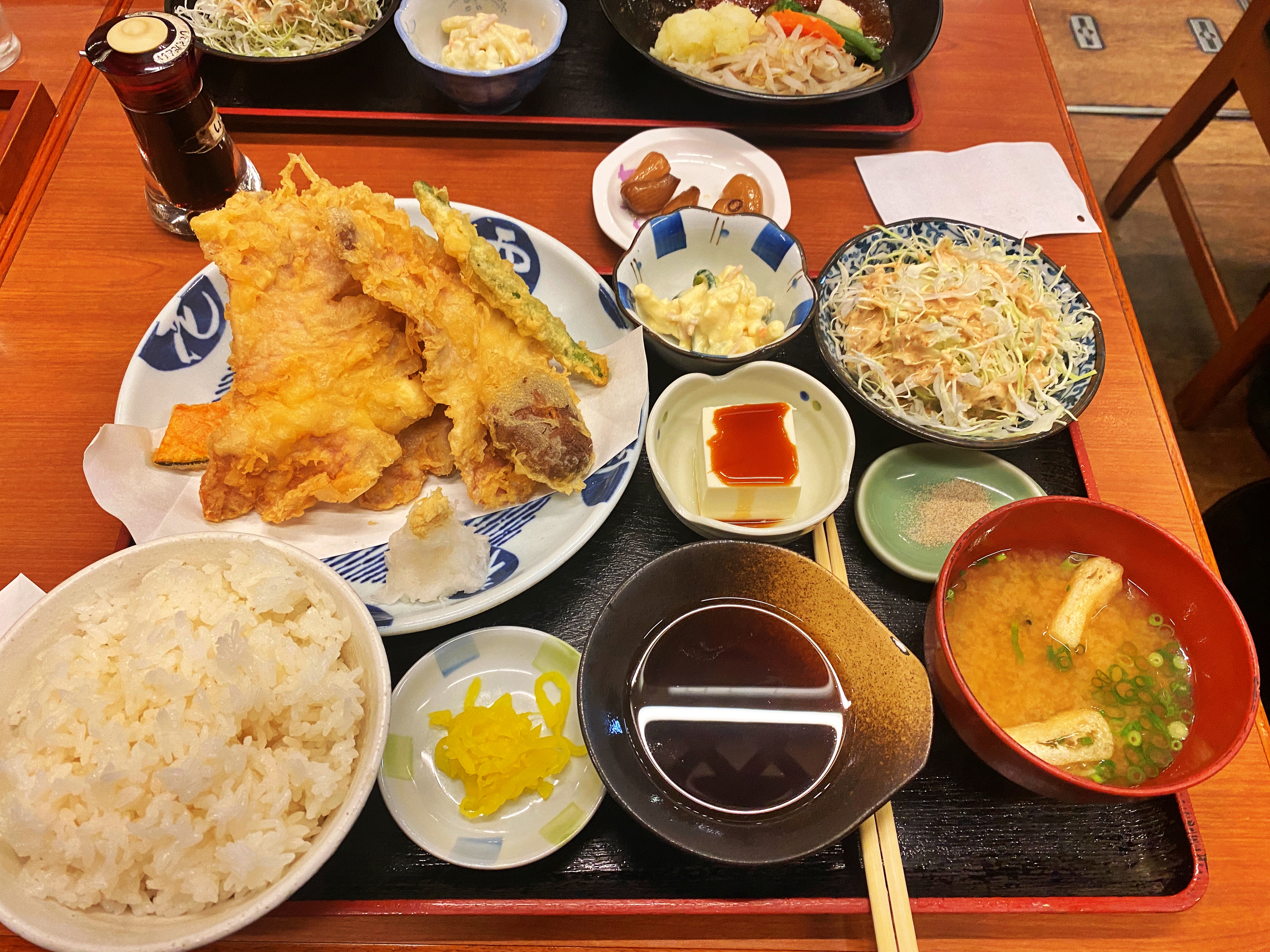 미소시루와 샐러드 연두부 같은 반찬도 반찬이지만, 고봉밥에 그냥 튀김 몇 개 올라가고 말 거 같았던 메뉴가 상당히 알찹니다. 돼지 안심으로 추정되는 부위를 얇게 펴서 튀겨냈습니다. 거기에 단호박이나 고추 같은 채소들도 함께 튀겨냈네요. 바삭바삭하고 맛도 좋습니다. 1000엔이 아깝지 않았습니다.