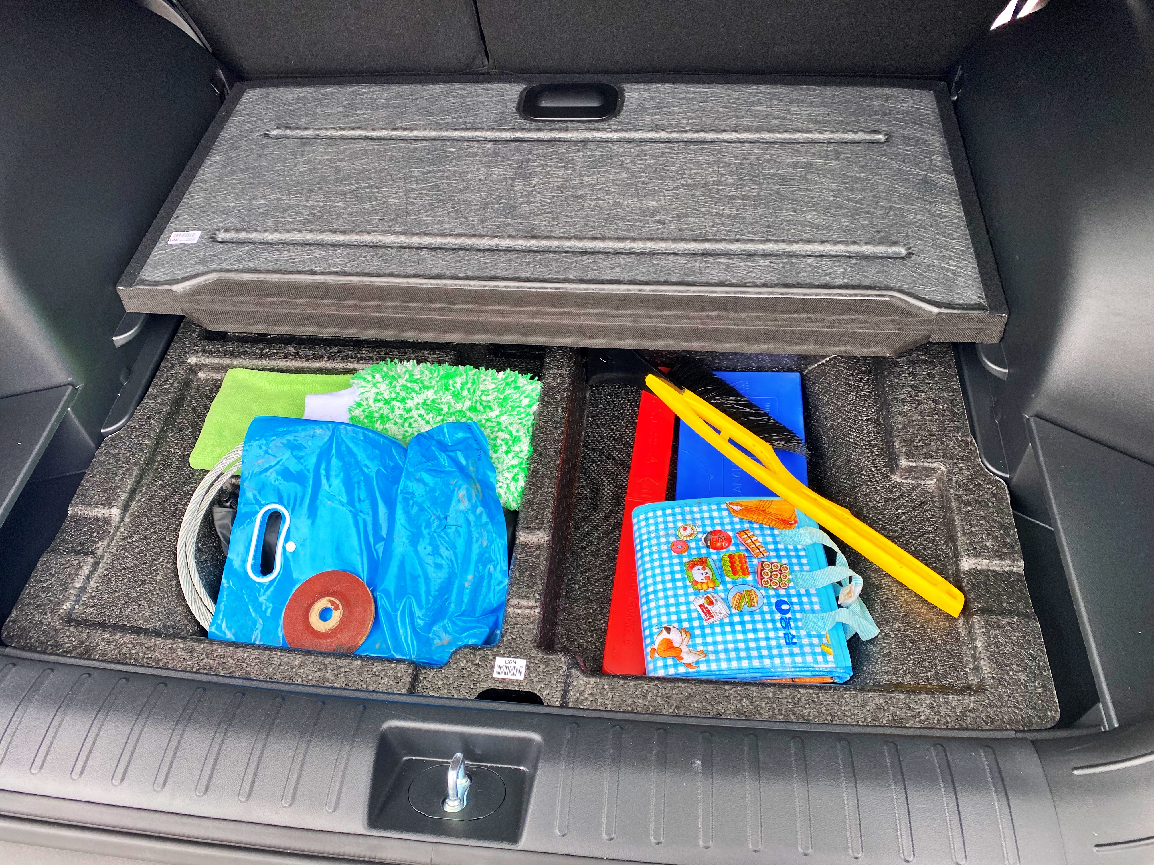 커버를 완전히 열면 안쪽으로 콤프레셔와 리페어리킷트가 보입니다. 그리고 수납함을 들춰내도 그리 깊지 않습니다. 그렇다 보니 자잘한 물건들만 여기 숨겨놓고 논슬립 재질의 트렁크 매트를 따로 구입하여 사용해야 합니다.