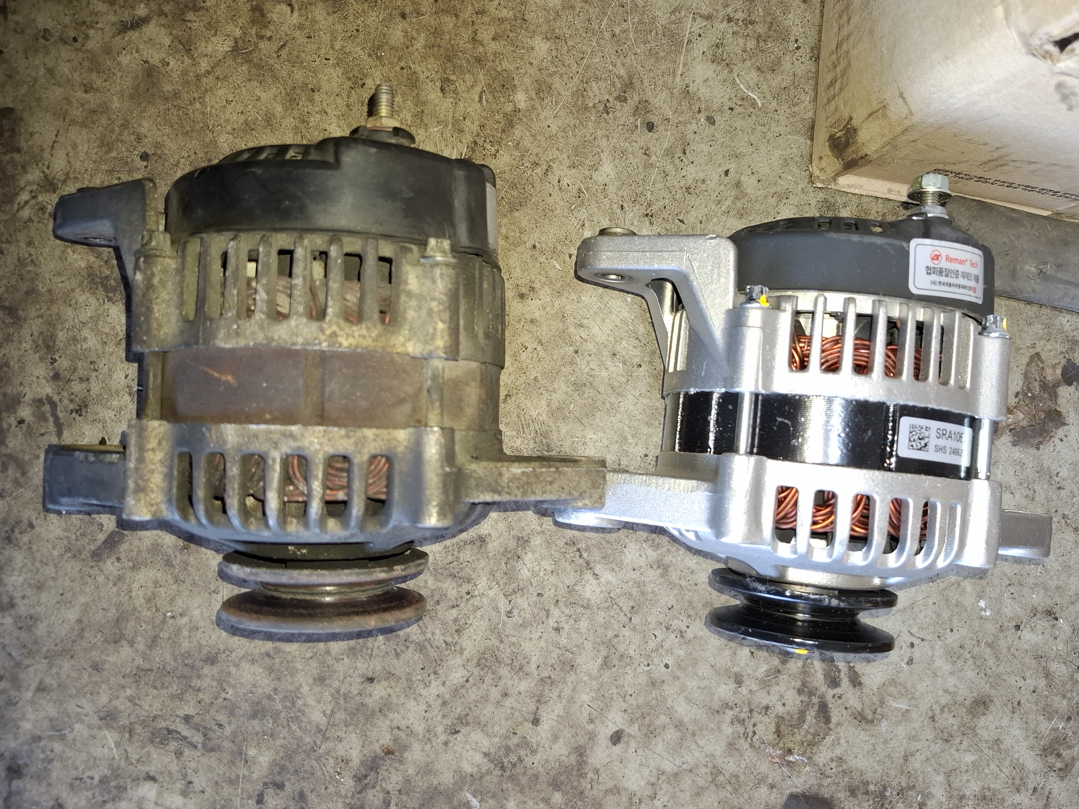 확실히 미션오일만 교체하더라도 기어가 체결되는 느낌이 부드러워진다는 게 몸으로 느껴집니다. 겸사겸사의 작업이었던지라 발전기도 바로 탈거되었고 기존 발전기와 신품 발전기를 비교합니다.
