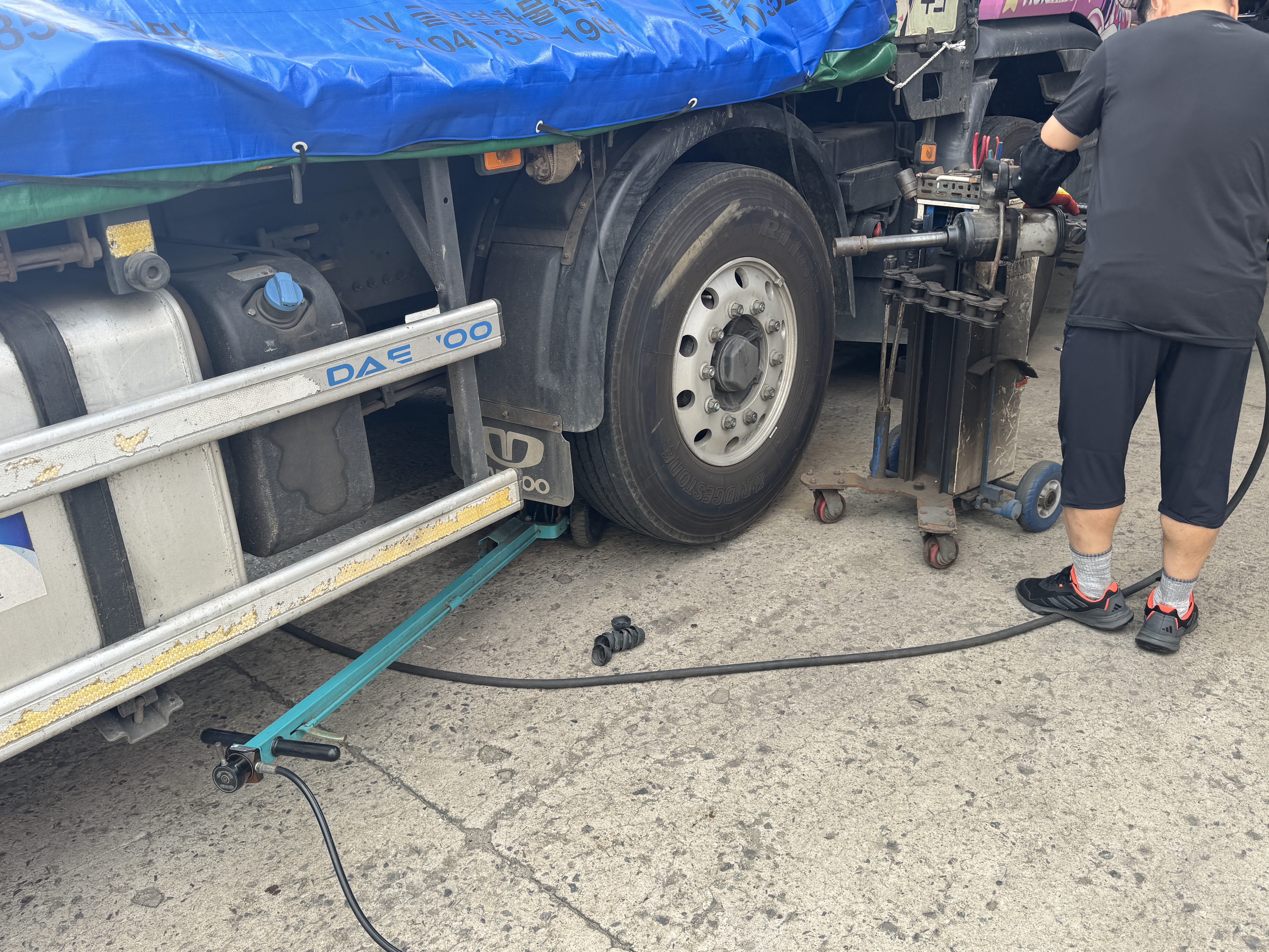 그렇게 다음날 일입니다. 화물차를 타고 잠깐 집에 왔는데, 우측 2축 타이어에 반생이가 박힌 모습이 보이더군요. 아무리 빼려 해도 빠지지 않아 스쿠터를 타고 다이소에 가서 펜치를 사다 힘겹게 빼냈는데 공기압이 새기 시작합니다. 그래서 홍성까지 다시 나가서 펑크를 때우기로 합니다.