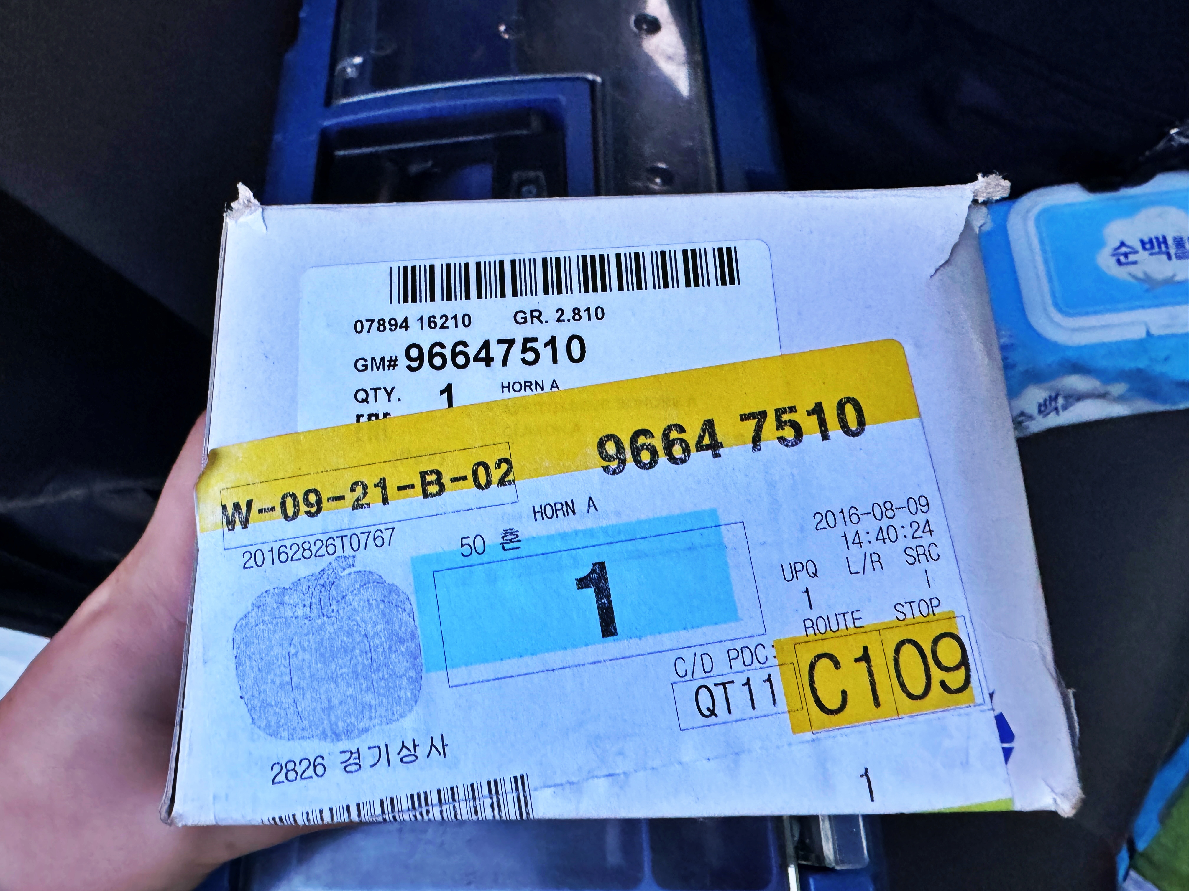 P96647510 혼. 대우의 중형차 토스카혼입니다. 토스카에는 혼이 두개가 들어간다고 합니다. 하이 로우로요. 이게 고음영역의 혼인지 저음영역의 혼인지도 모르고 달았습니다만 고음 혼이네요. 스파크에서 나는 경적소리가 납니다.