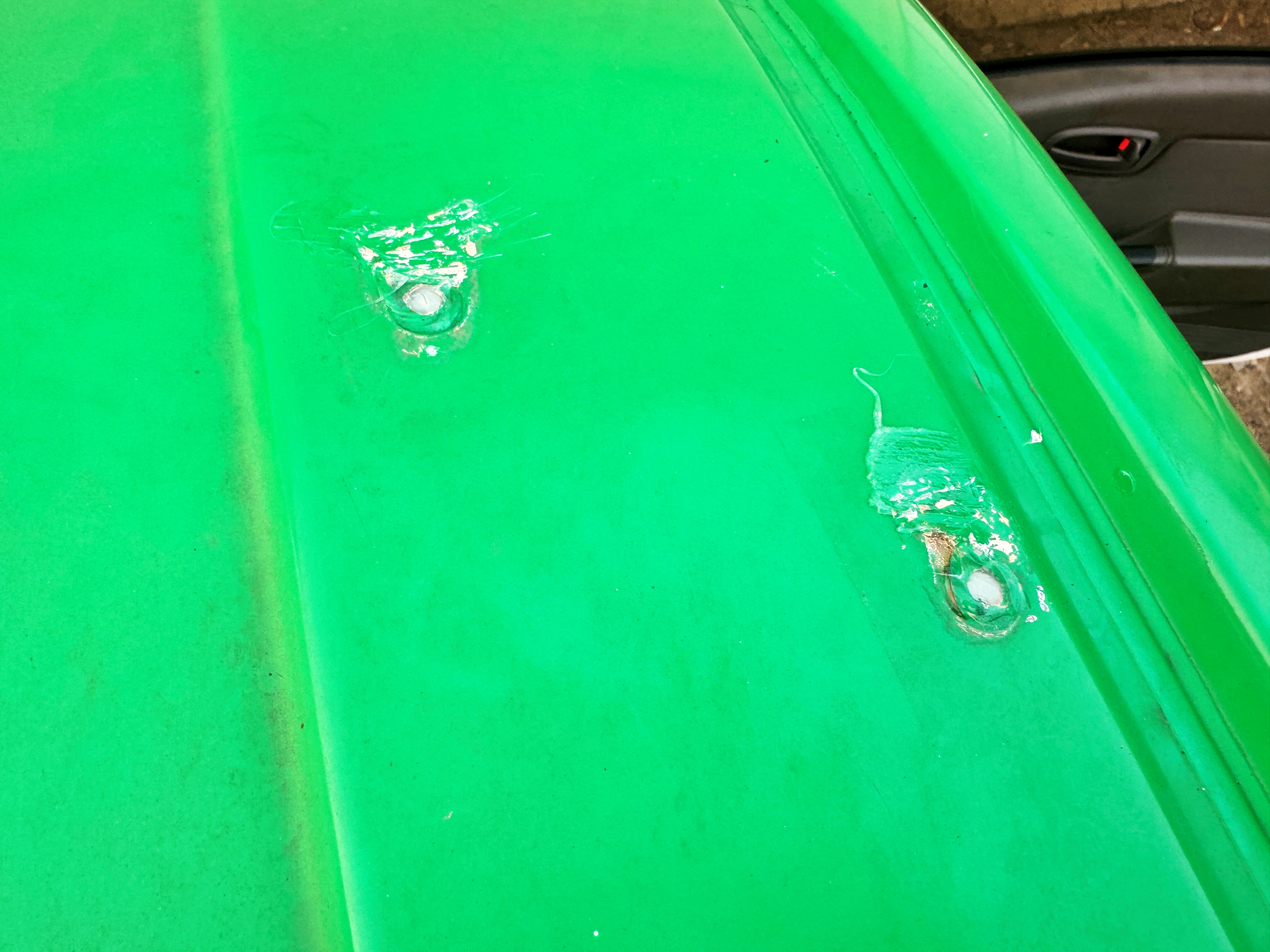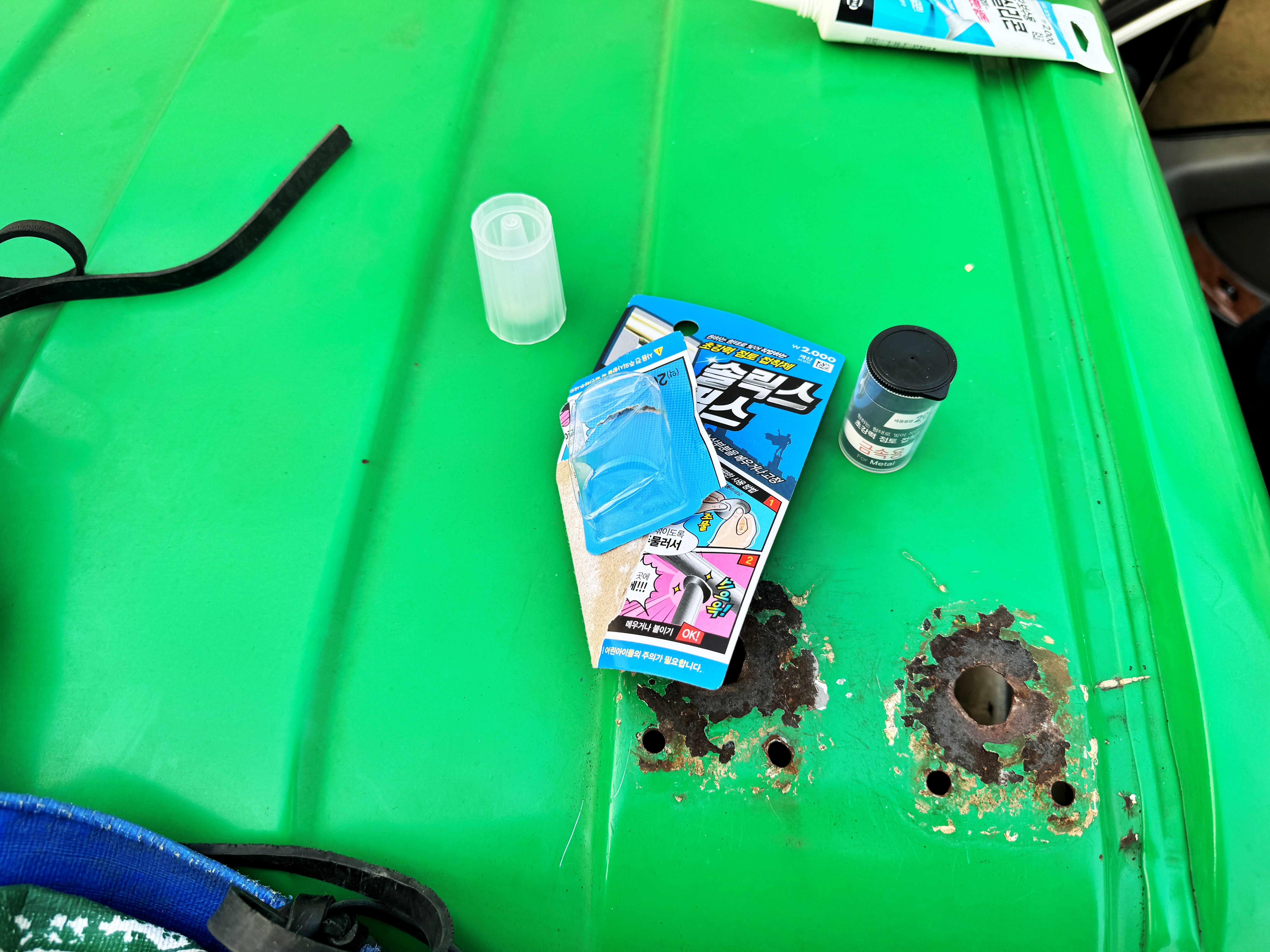 에어혼을 달기 위해 천장에 구멍을 뚫었습니다. 에어호스가 들어가야 하기에 꽤 큰 구멍을 뚫어야 합니다. 엄지손가락도 거뜬히 들어가는 구멍이 참 보기 싫게 났습니다. 방청처리를 잘 하지 않아 부식도 좀 있고요.