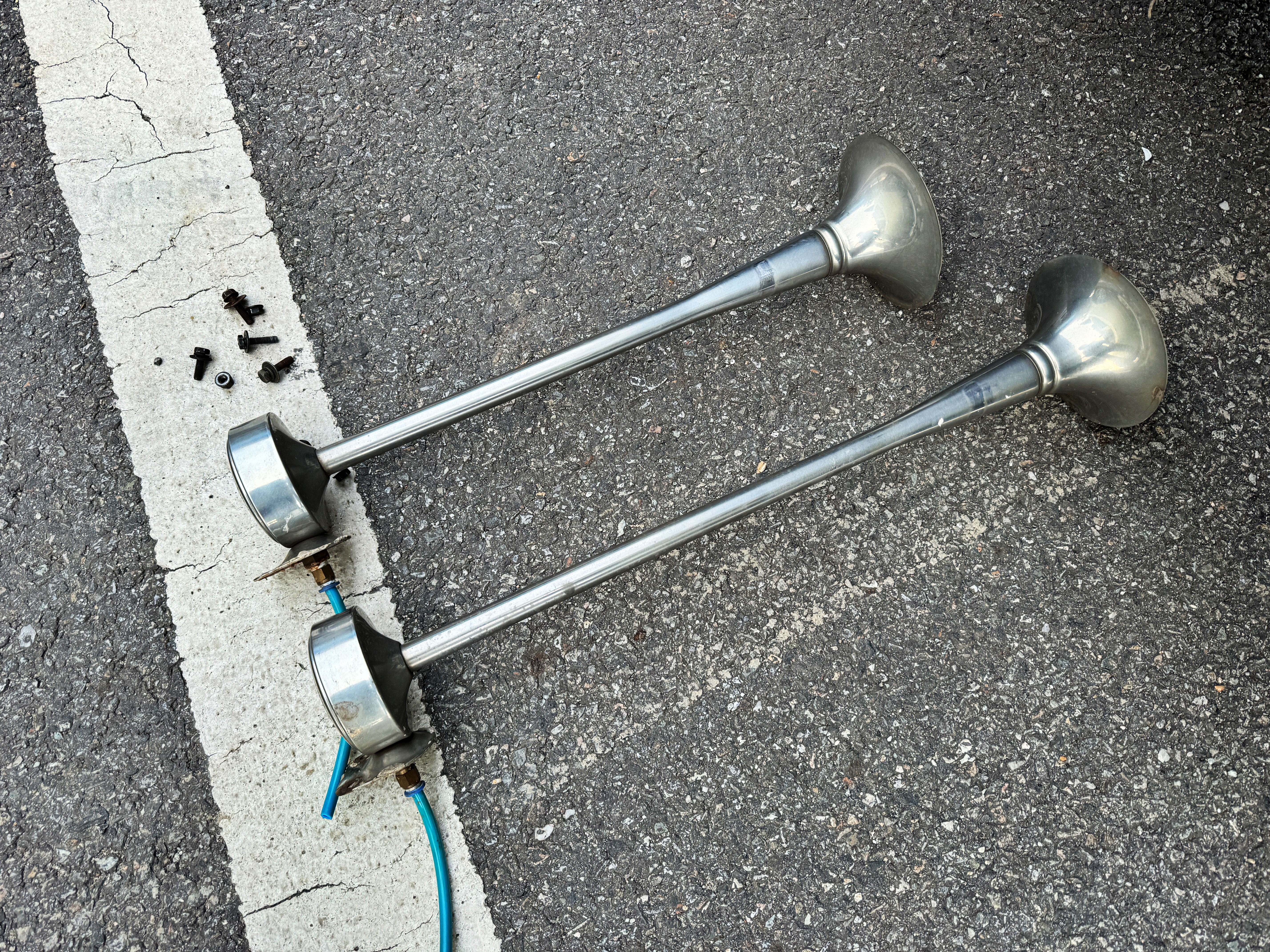 호스는 그냥 끊었습니다. 저거 일일히 분리할 시간도 없고 무엇보다도 귀찮습니다. 미국산 피암(FIAMM)제 에어혼입니다. 얼마에 올릴까 하다가 상태도 지저분하고 나팔 끝에 살짝 휜 부분도 있어 7만원에 올렸더니만 바로 팔리네요. 저렴하긴 저렴하죠.