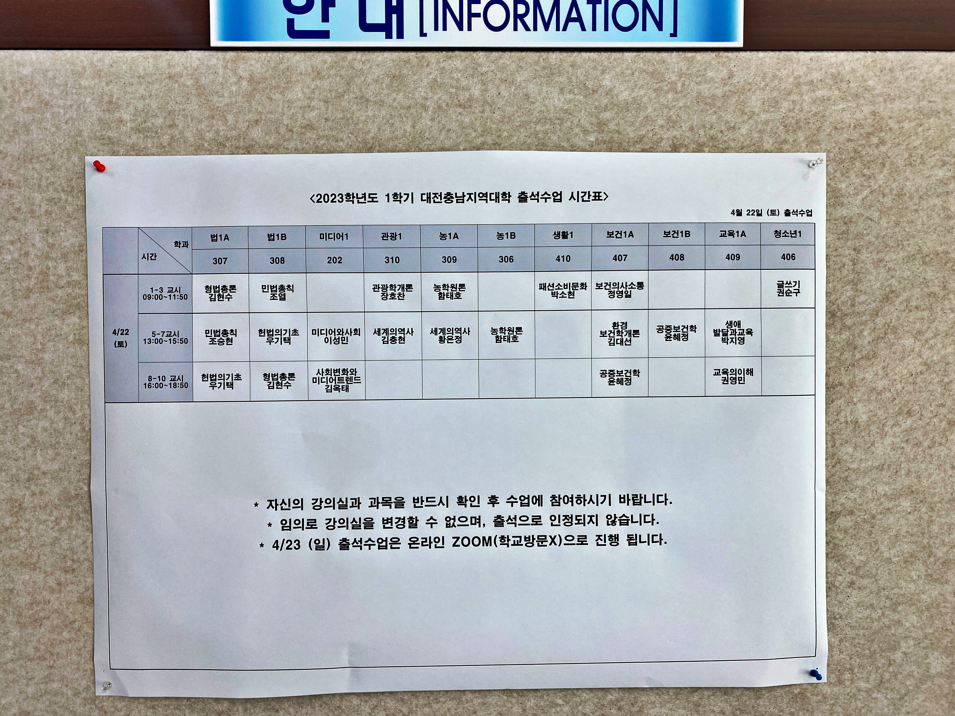 예전에는 각 수업별 출석부를 걸어놓아서 내 이름이 있는 강의실에 들어갔었던 걸로 기억하는데 그냥 알아서 보고 수업을 찾아서 들어가라고 이렇게 붙여놨네요. 저한테는 일반선택 교양이지만 타과에서는 전공처럼 듣는 과목이기에 다시 확인하고 들어갑니다.