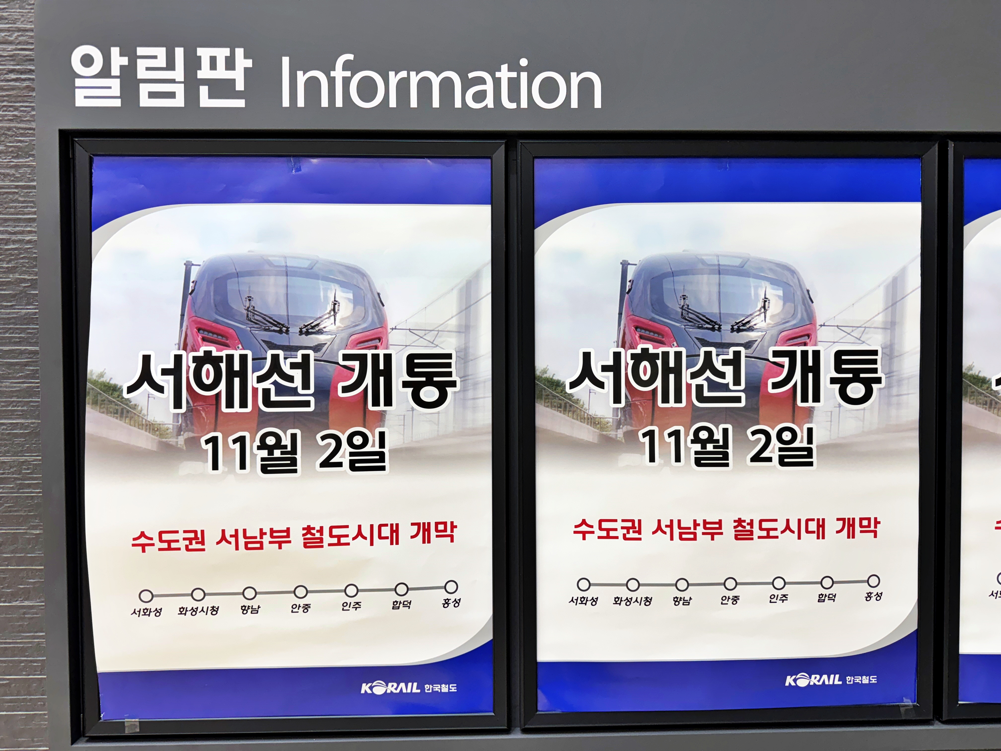 역사 대합실 알림판에 붙어있는 포스터의 문구 그대로 수도권 서남부 철도시대가 개막합니다.