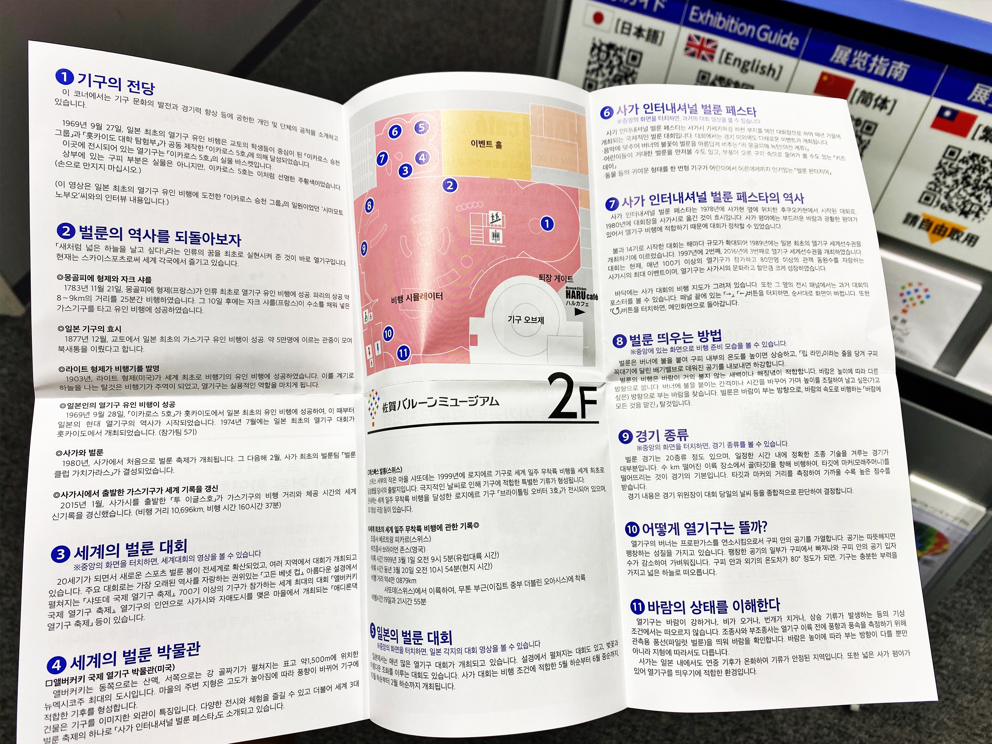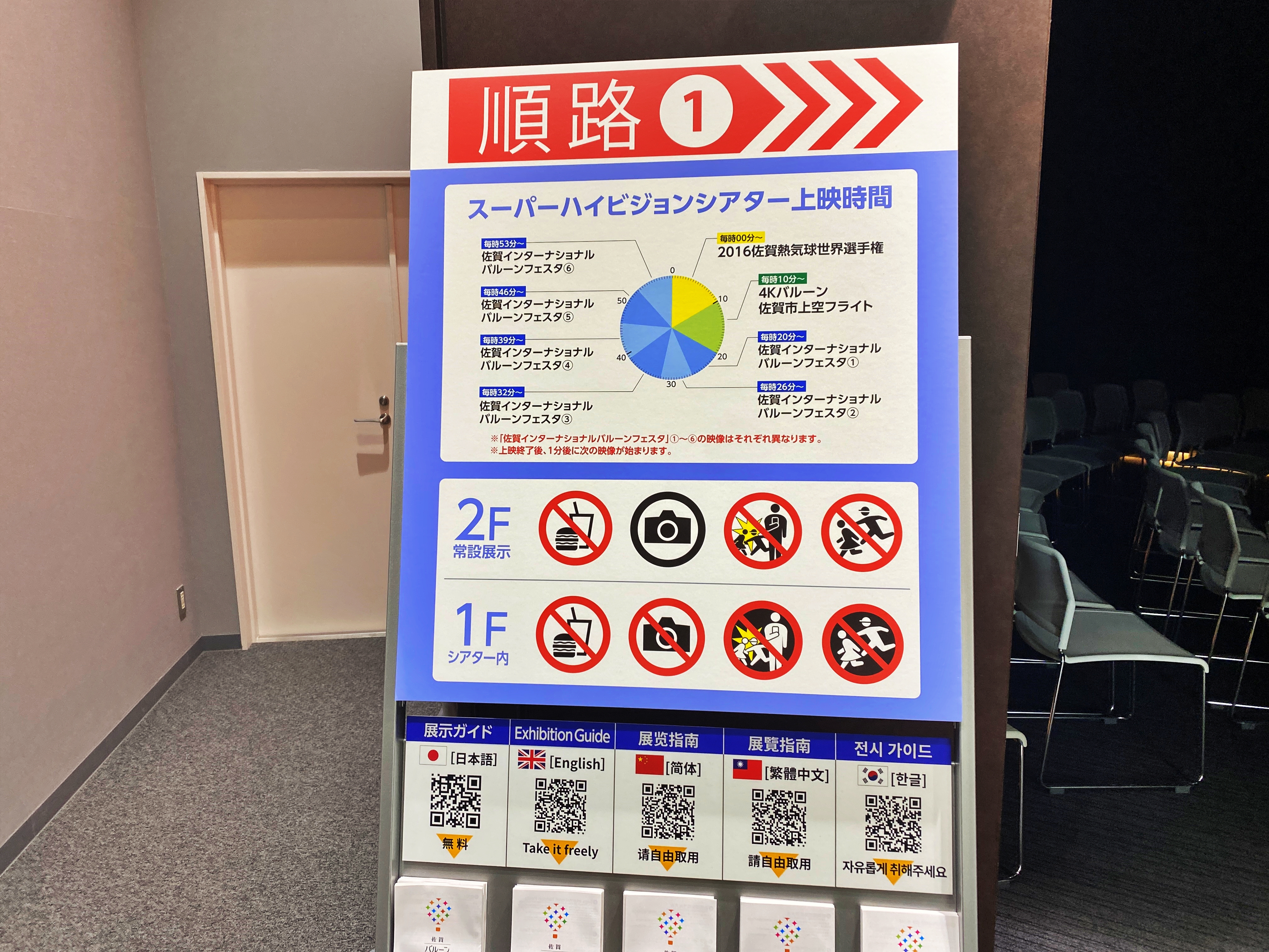 60분간 상영된다고 하는데 약 10여분정도 2016년 '사가 인터내셔널 벌룬 페스타' 대회 영상을 보여주고 종료되었습니다. 계속 기다리면 다른 영상이 상영되던 것도 아니고 그냥 영상이 끝나니 2층 상설전시관으로 안내하더군요. 전시 가이드는 일본어 영어 중국어(간체, 번체)와 함께 한국어로도 준비되어 있습니다. QR코드를 찍어 링크로 이동하거나 전시 가이드를 받아 보고 가면 됩니다.