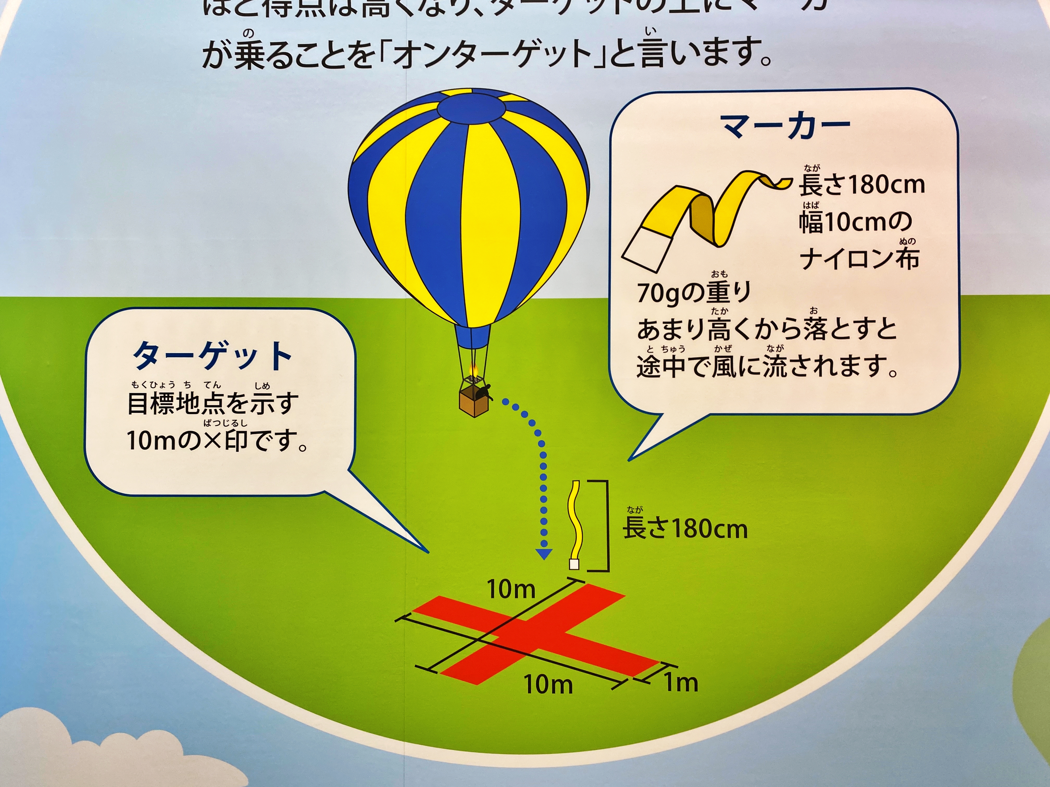 타게또(타겟)는 1m 굵기의 선을 10m로 늘여놓고 교차한 X자 표식이라고 합니다. 마커에 에 대한 설명도 위에서 언급한 것과 같이 모래주머니의 중량은 70g. 나일론 끈의 길이는 180cm이라고 합니다. 너무 높은 곳에서 떨어뜨리면 바람에 휩쓸려 간다고 하네요. 적당한 타이밍이 중요하게 여겨진다고 합니다.