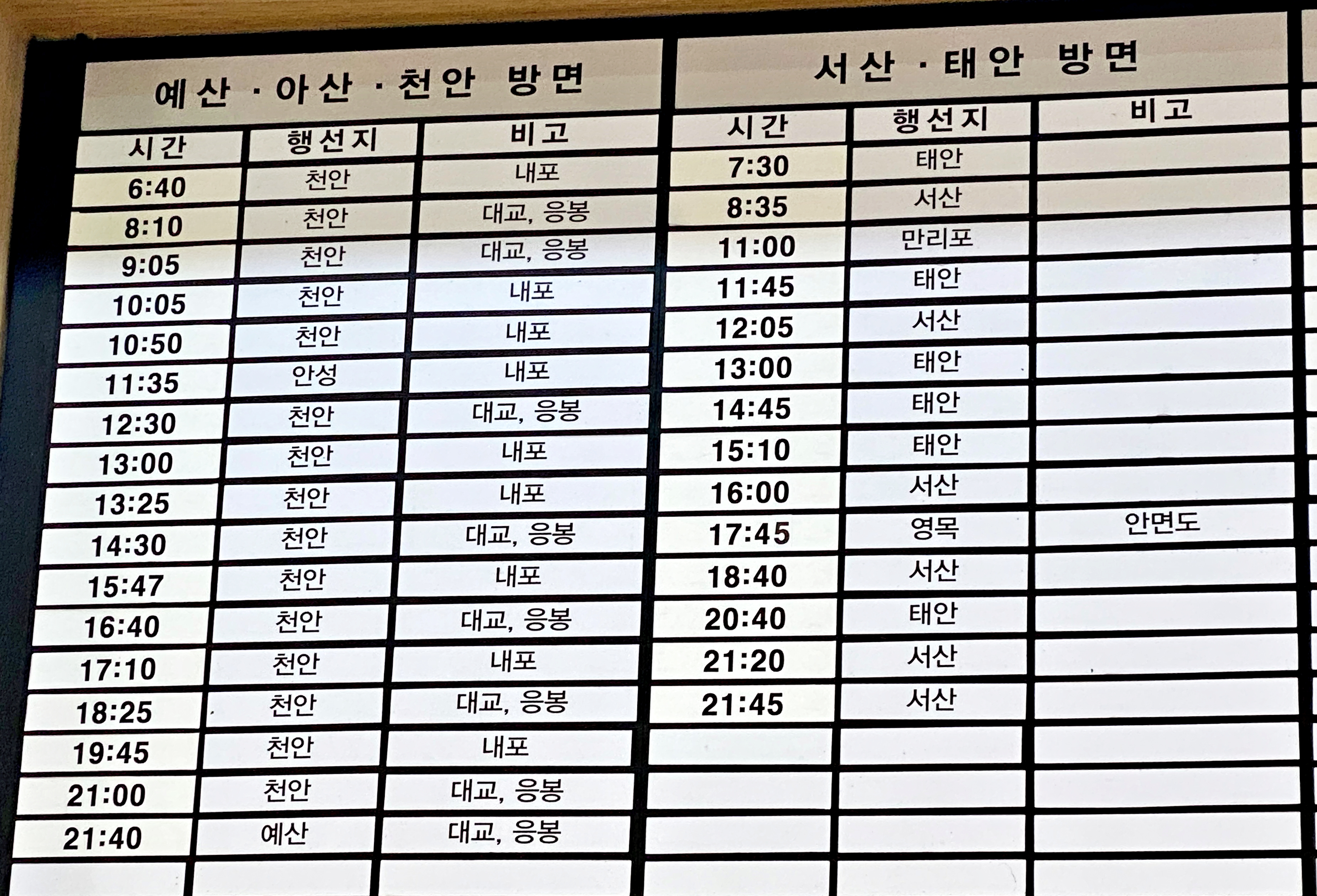 예산, 아산, 천안 및 서산 태안 방면 시간표입니다.