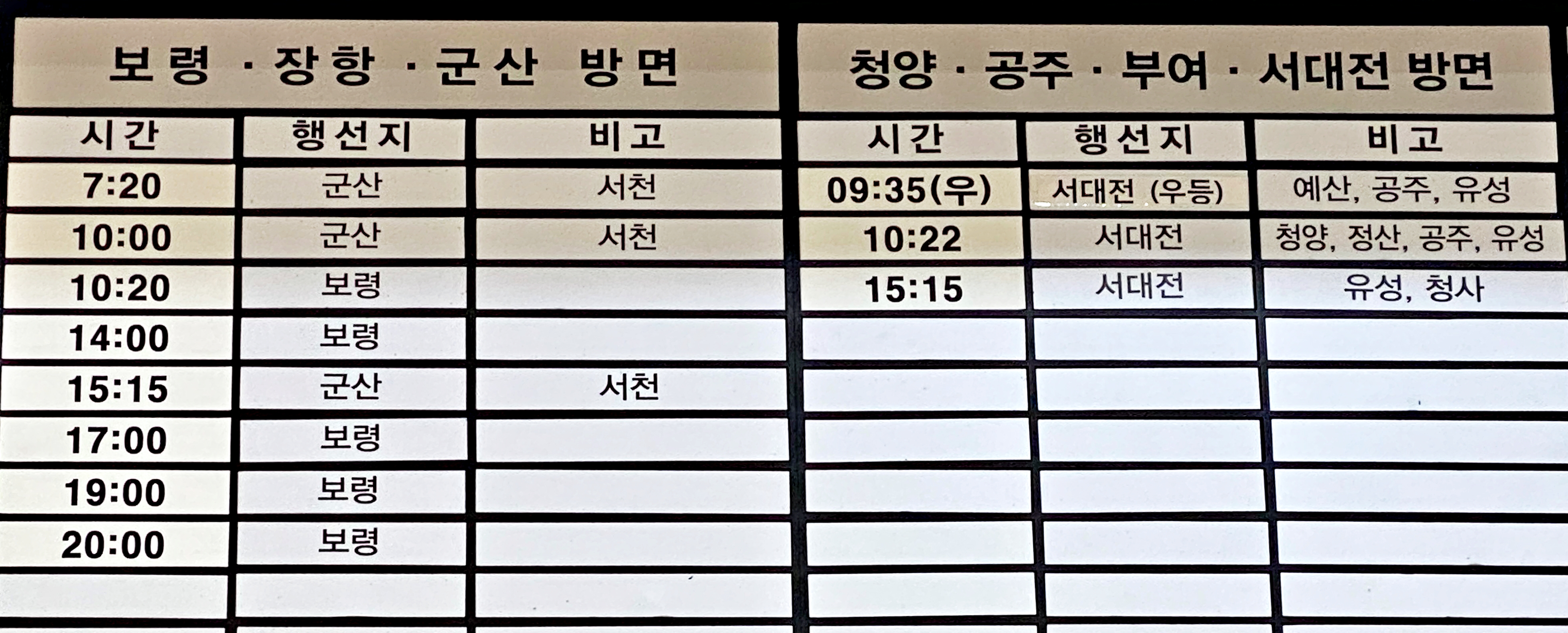 보령,장항,군산 및 청양 공주 부여 서대전 방면 시간표입니다.