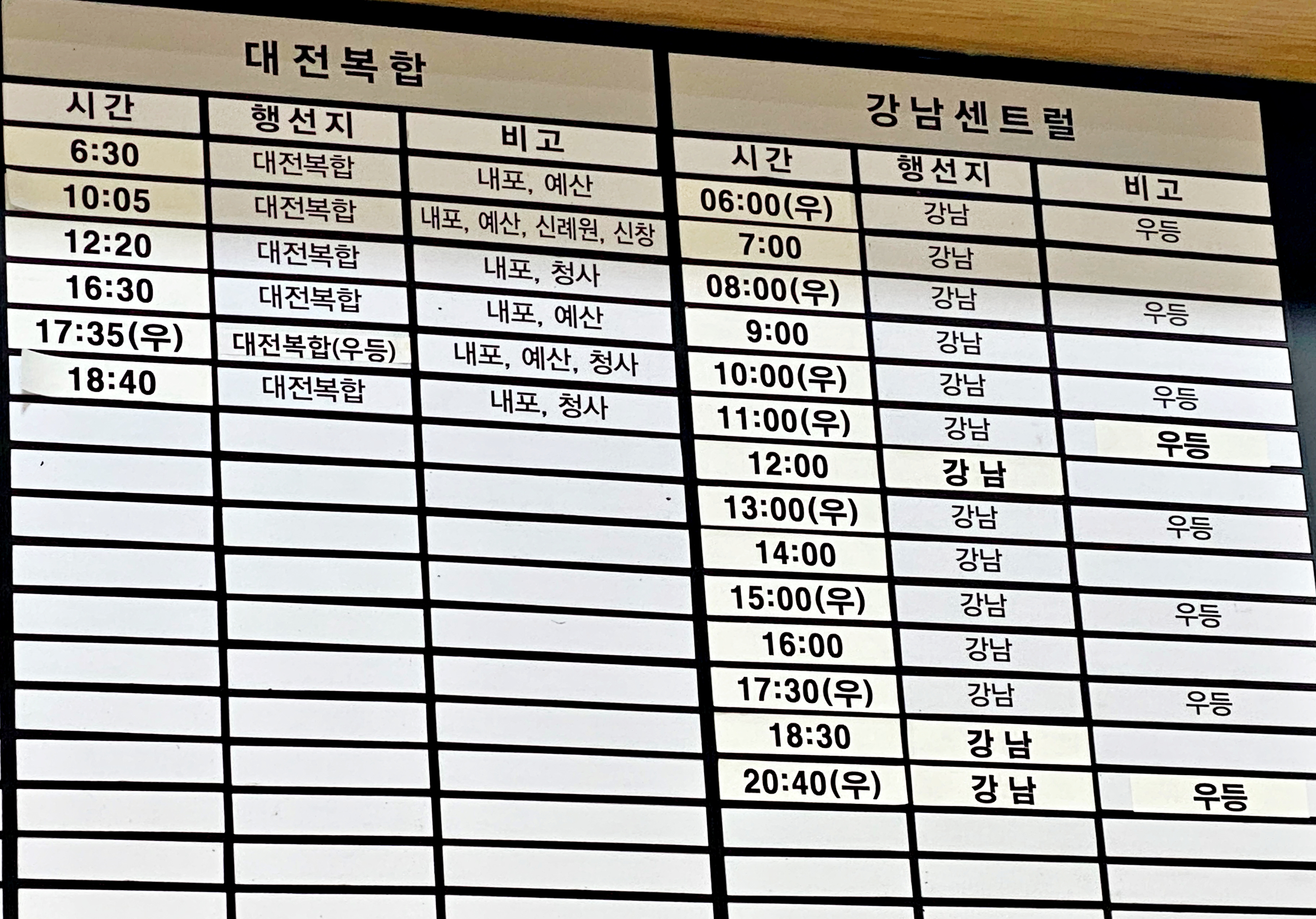 대전과 서울행 시간표입니다.