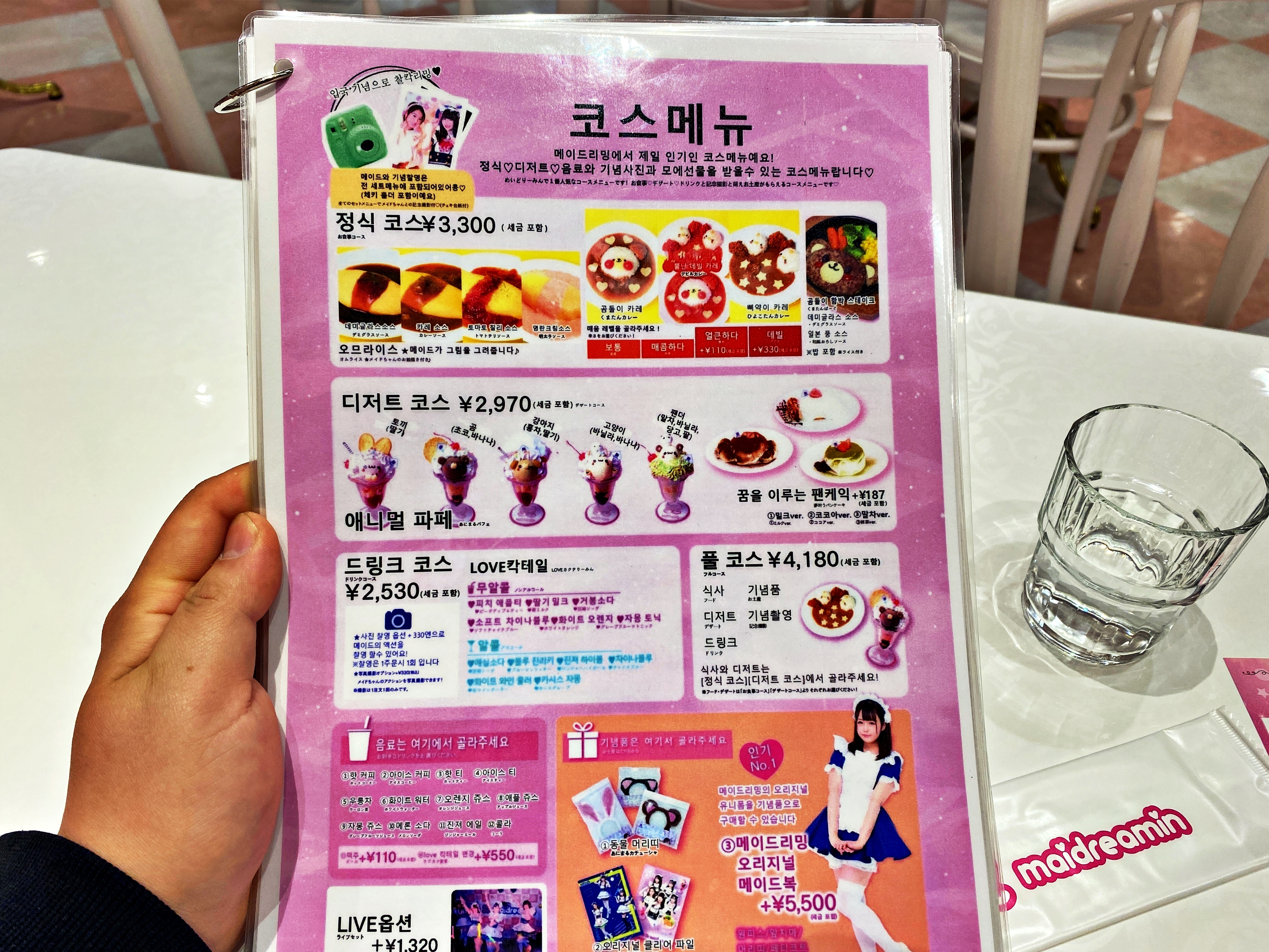 정식 코스는 오므라이스나 카레 스테이크 중 선택이 가능하고 디저트 코스는 프라페가 기본으로 나오고 팬케익을 추가하면 펜케익도 나온다고 합니다. 드링크 코스는 말 그대로 무알콜 혹은 알콜이 함유된 칵테일을 선택할 수 있습니다. 드링크 코스에 330엔을 더하면 기념촬영이 추가되기도 하고요.