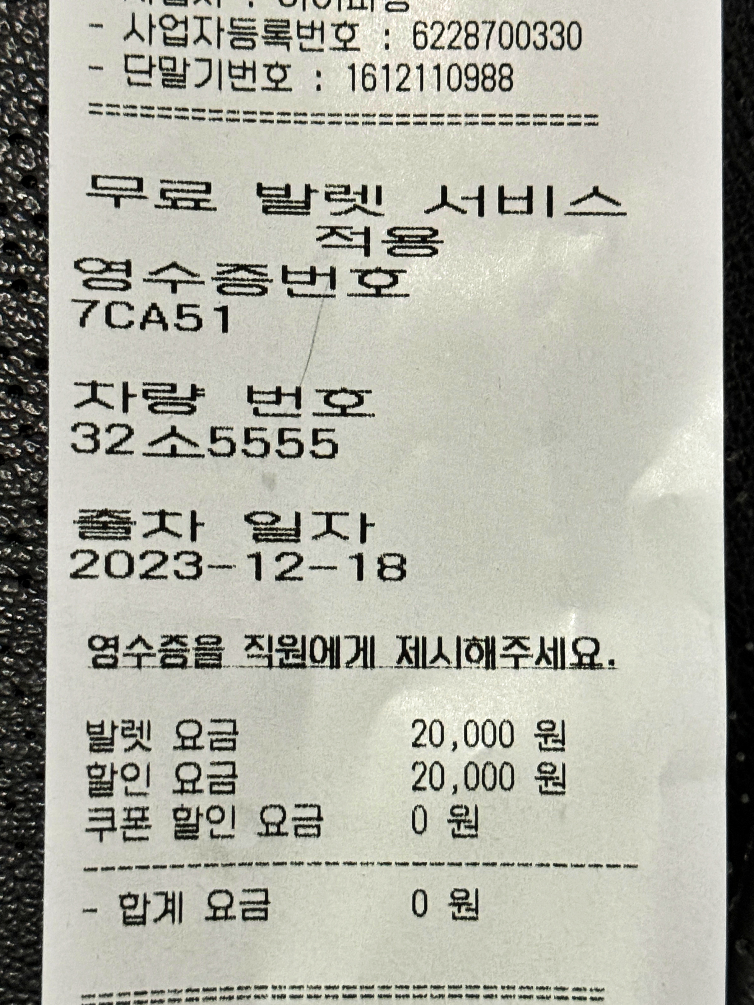 신용카드 혜택으로 발렛비는 없습니다. 전기차라 주차비도 반값인지라 장기주차장에 세우고 한참을 오는 것보다 단기주차장에 발렛파킹으로 넣는 것이 훨씬 이득입니다.