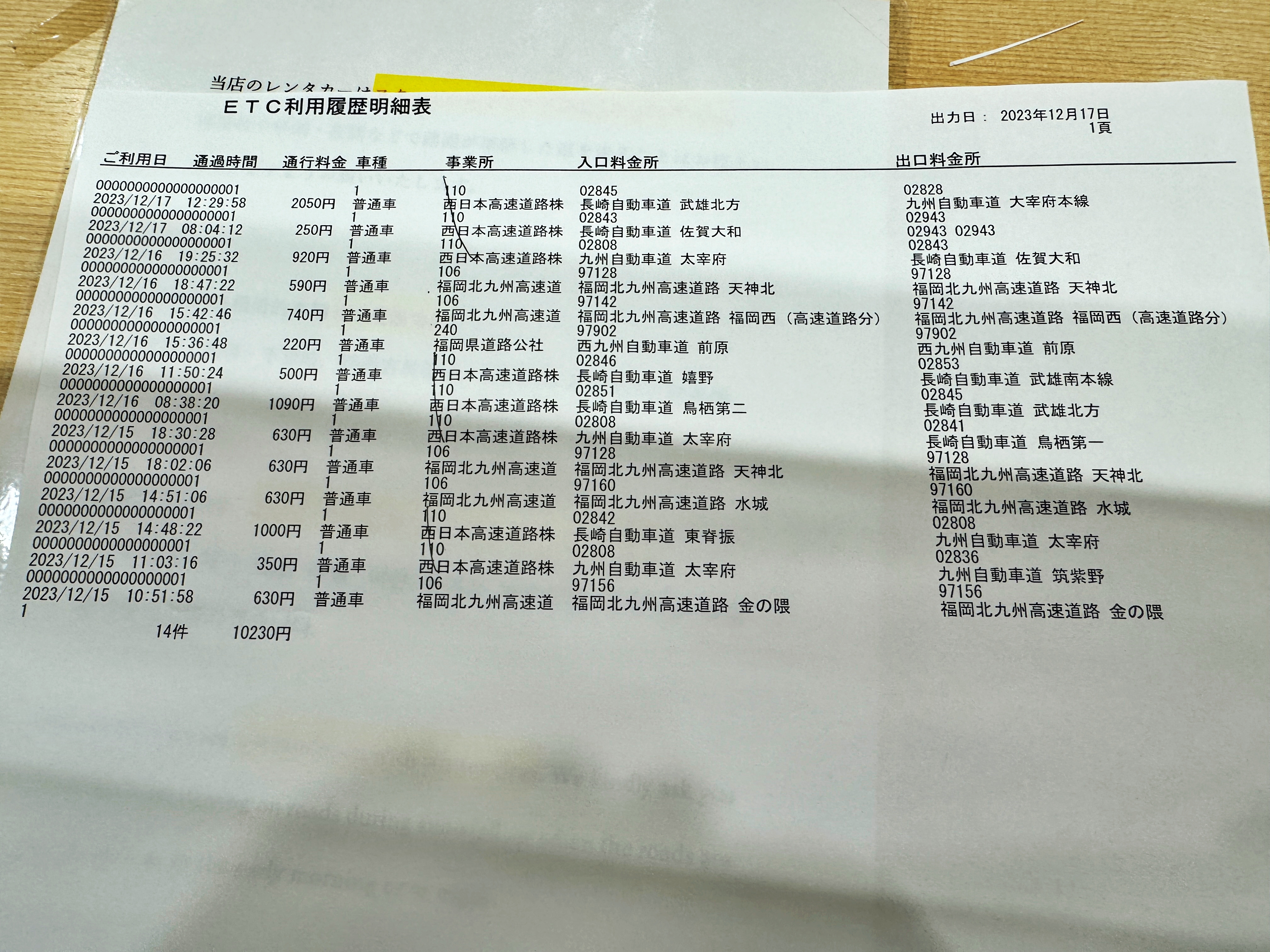 ETC로 통과하고 이렇게 렌터카 반납시 따로 정산해서 납부하면 됩니다. 도시고속도로 이용요금이 거의 KEP 요금 수준이 나왔네요. 그럼에도 총액을 따져본다면 2800엔정도 이득을 봤습니다.