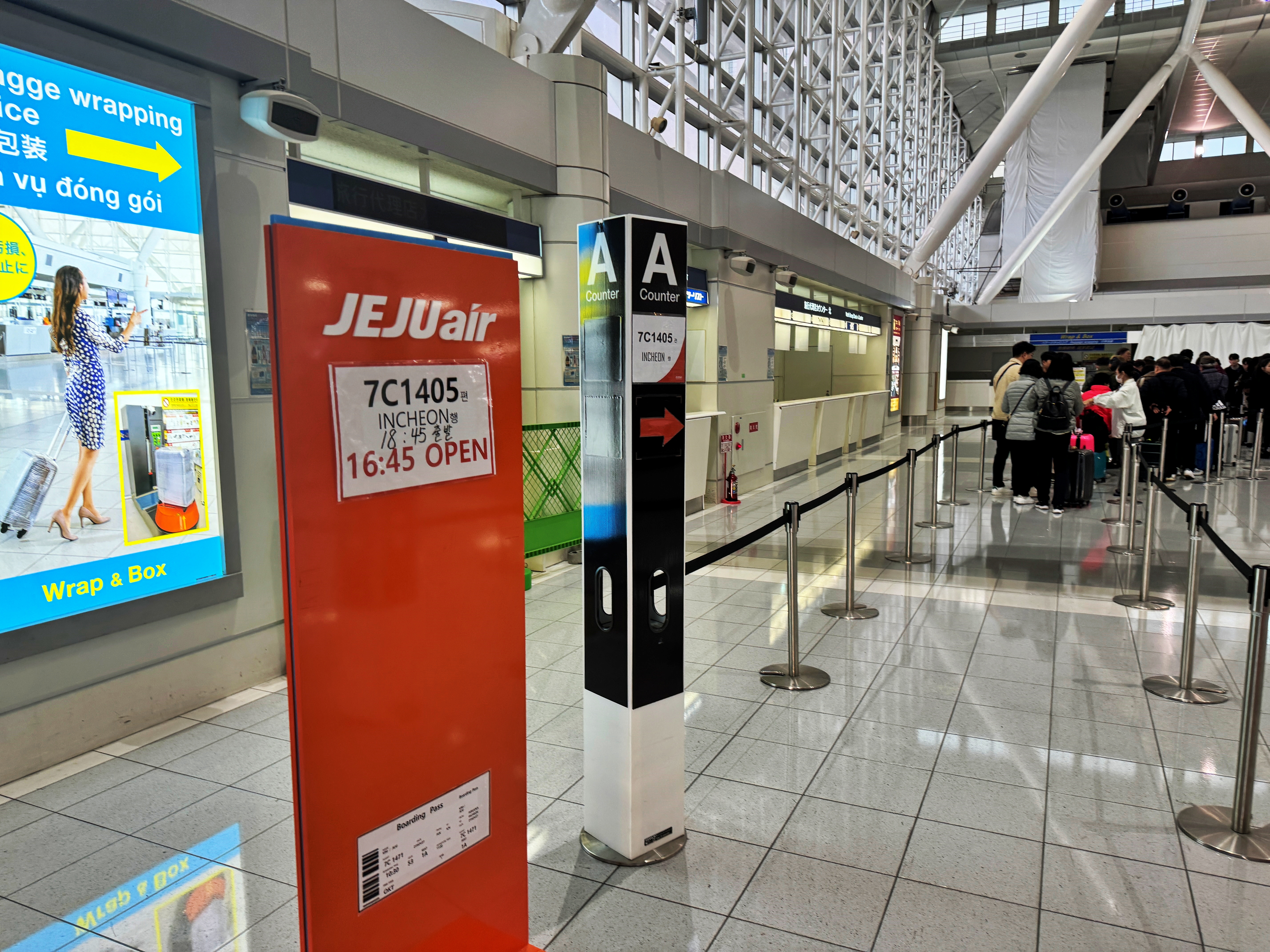 딱 국제선 터미널 2층의 제주항공 티켓팅 카운터에 오니 7C1405편의 티켓팅이 막 시작되었습니다.