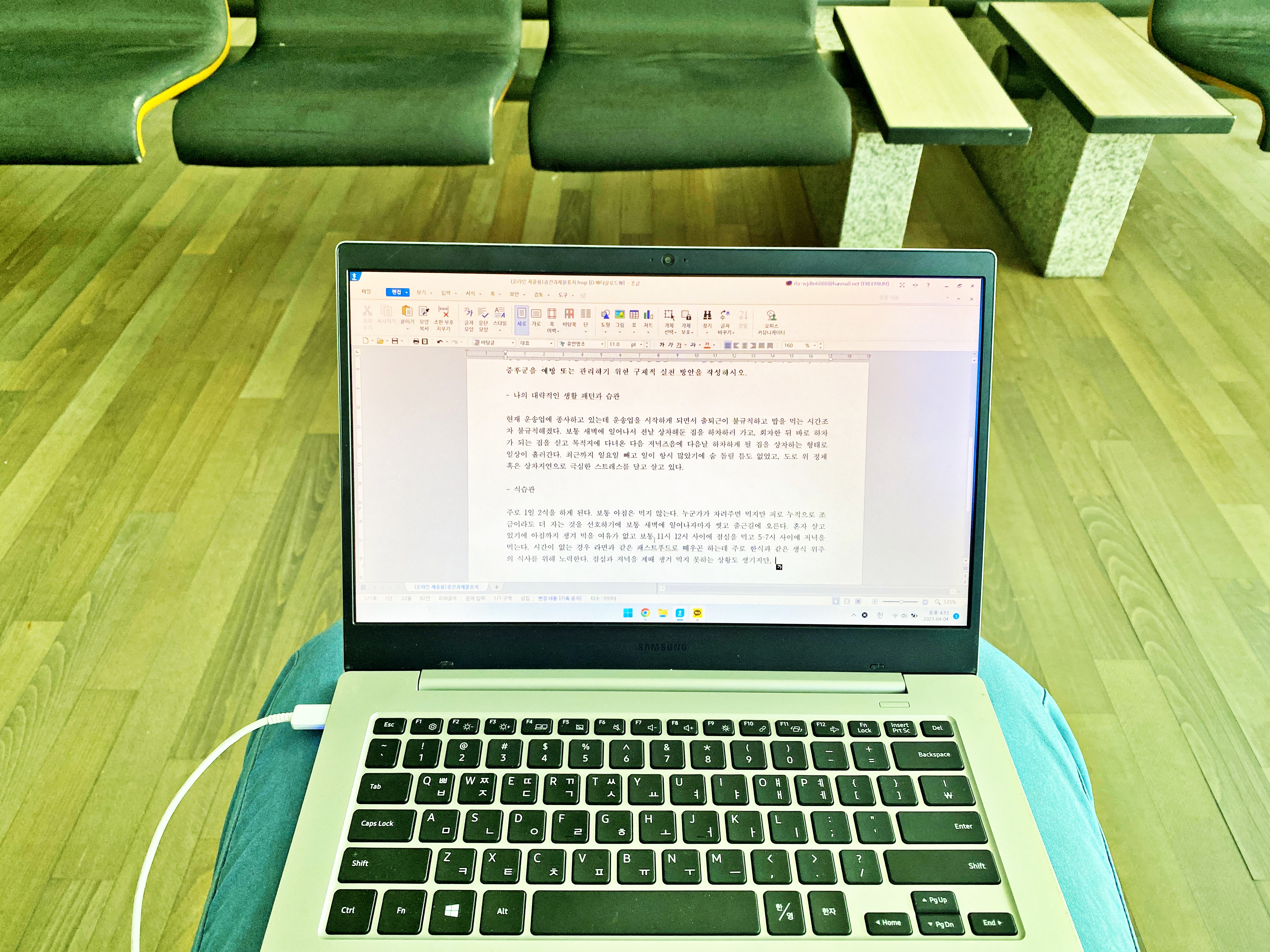 노트북을 펼치고 방통대 과제를 하고 있습니다.