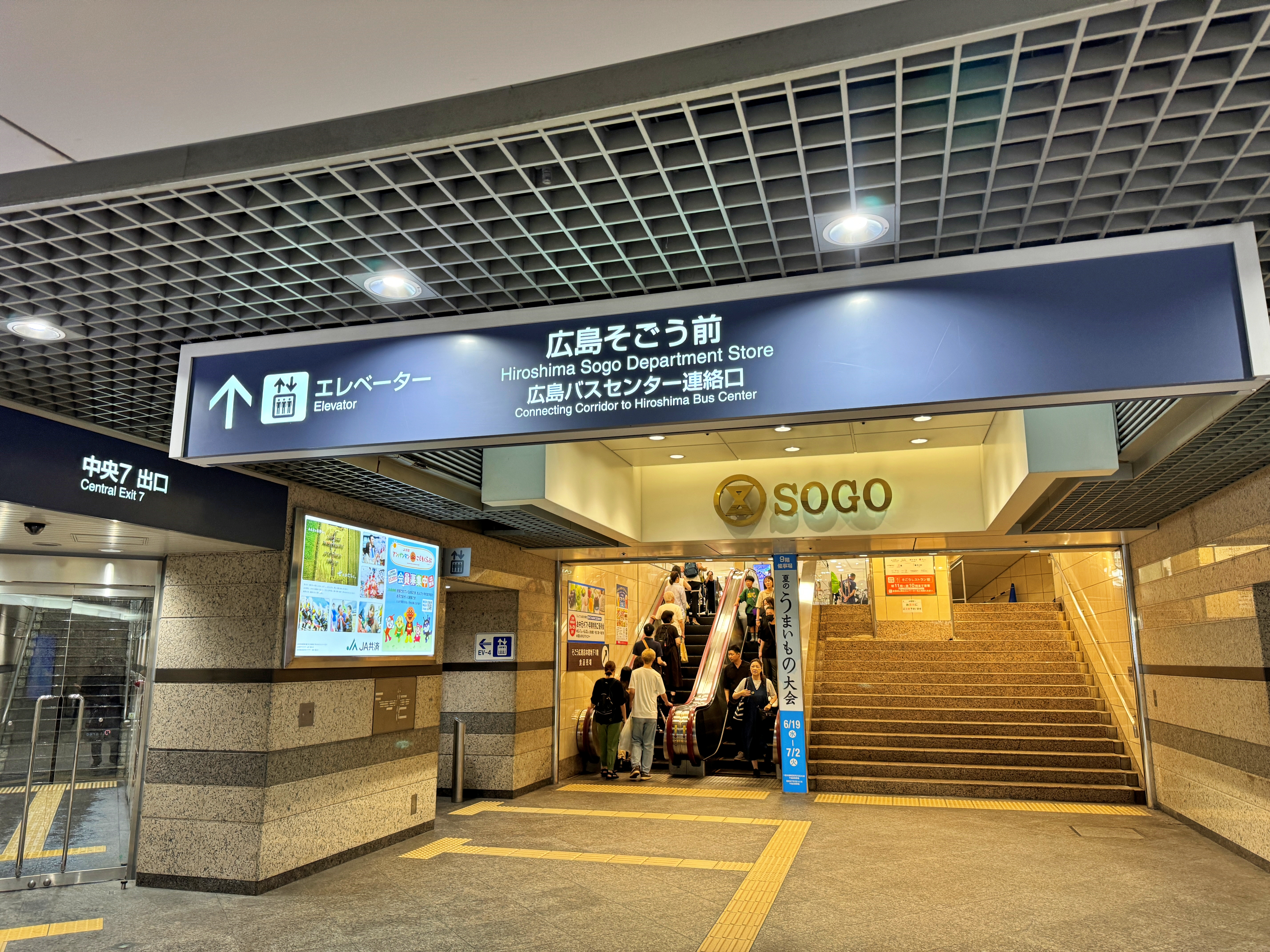 샤레오라는 이름의 상점가도 존재하고요. 히로시마성과 혼도리 그리고 원폭돔을 비롯한 주요 랜드마크들로 이 지하도를 통해 이동이 가능합니다. 비가 내리니 지하도를 타고 넘어갔습니다.