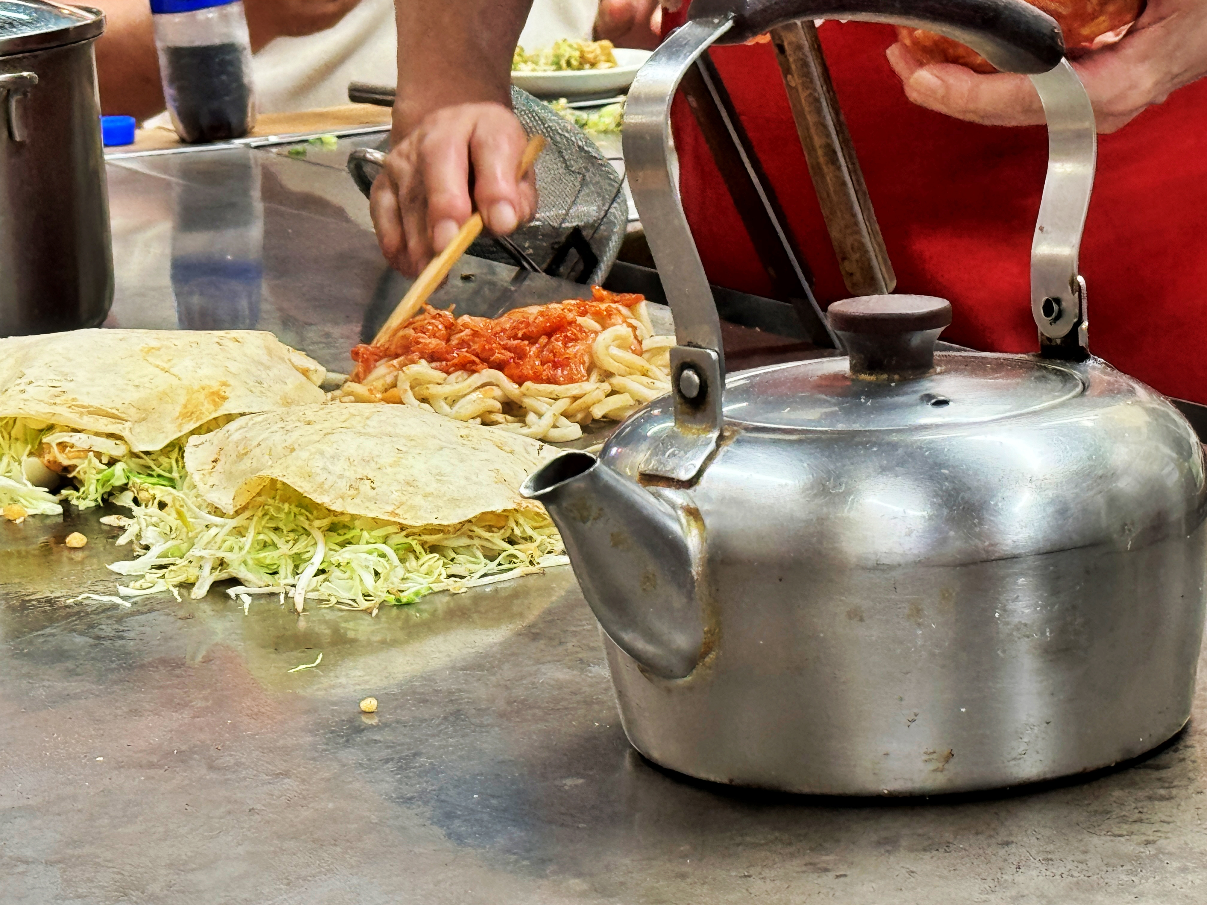 오코노미야끼가 만들어지고 있습니다.