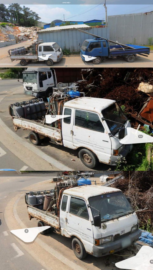 왜 멀지 않은 거리에 폐차장이 있는데 폐차장 대신 고물상에 차를 버렸는지 궁금해서 옛 로드뷰를 확인하니 2016년까지만 하더라도 가스통과 산소통이 적재함에 올려져 있네요. 즉. 이 고물상에서 사용하던 차량이라는 얘기가 되겠습니다. 대략적인 용도를 보아하니 철거현장처럼 고철이 나오는 장소에 출동하여 산소절단기를 사용해서 고철을 자르고 싣고 오던 목적으로 사용하지 않았나 싶습니다.