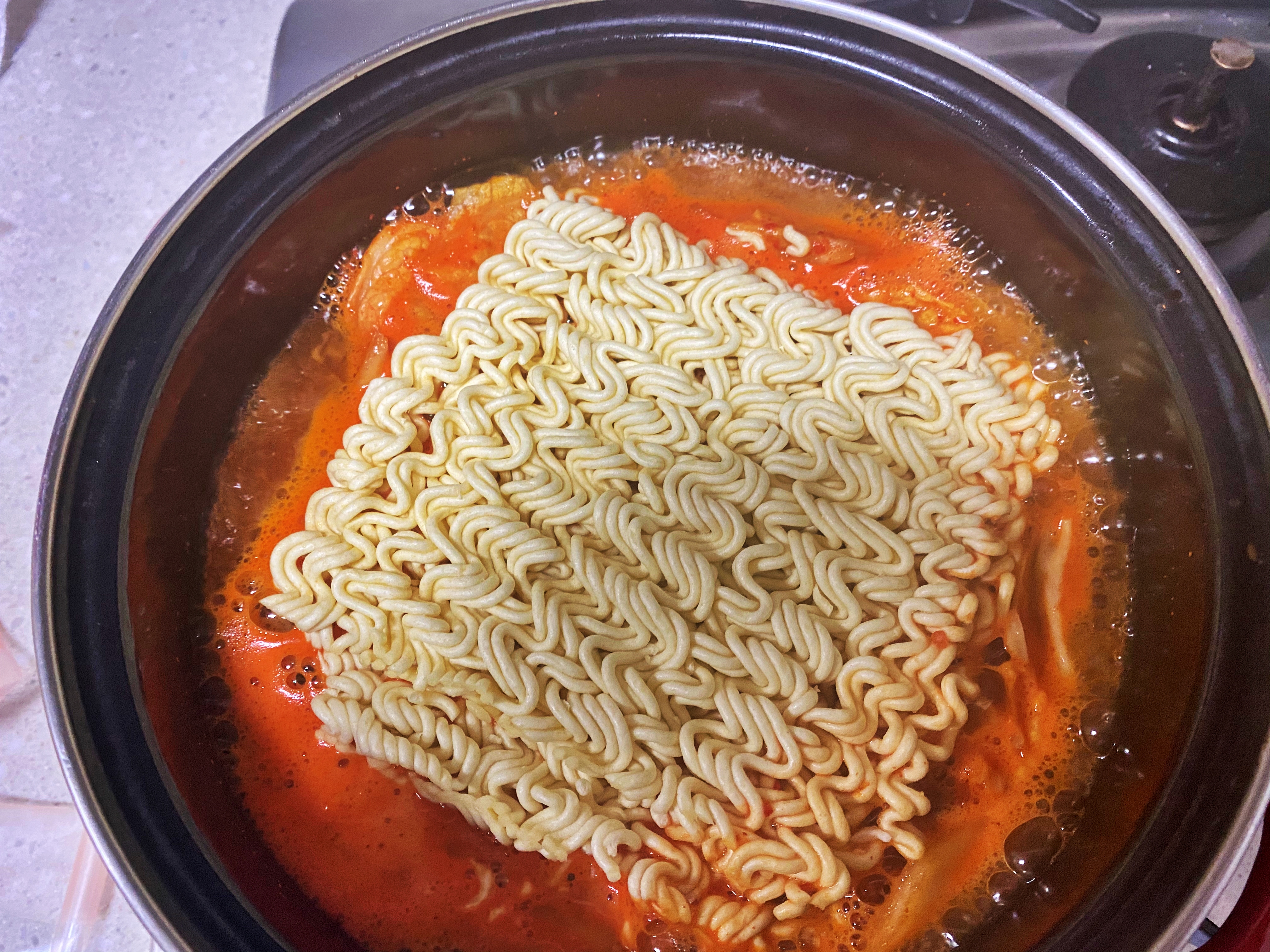 증발량을 고려하여 정량보다 아주 조금 더 계량하여 냄비에 부어줬습니다. 그리고 부대찌개 소스와 김치를 넣어준 뒤 물이 끓기만을 기다려 줍니다. 그냥 물만 끓일때보다 양념이 들어가니 조금 더 빨리 끓어오르겠지요.