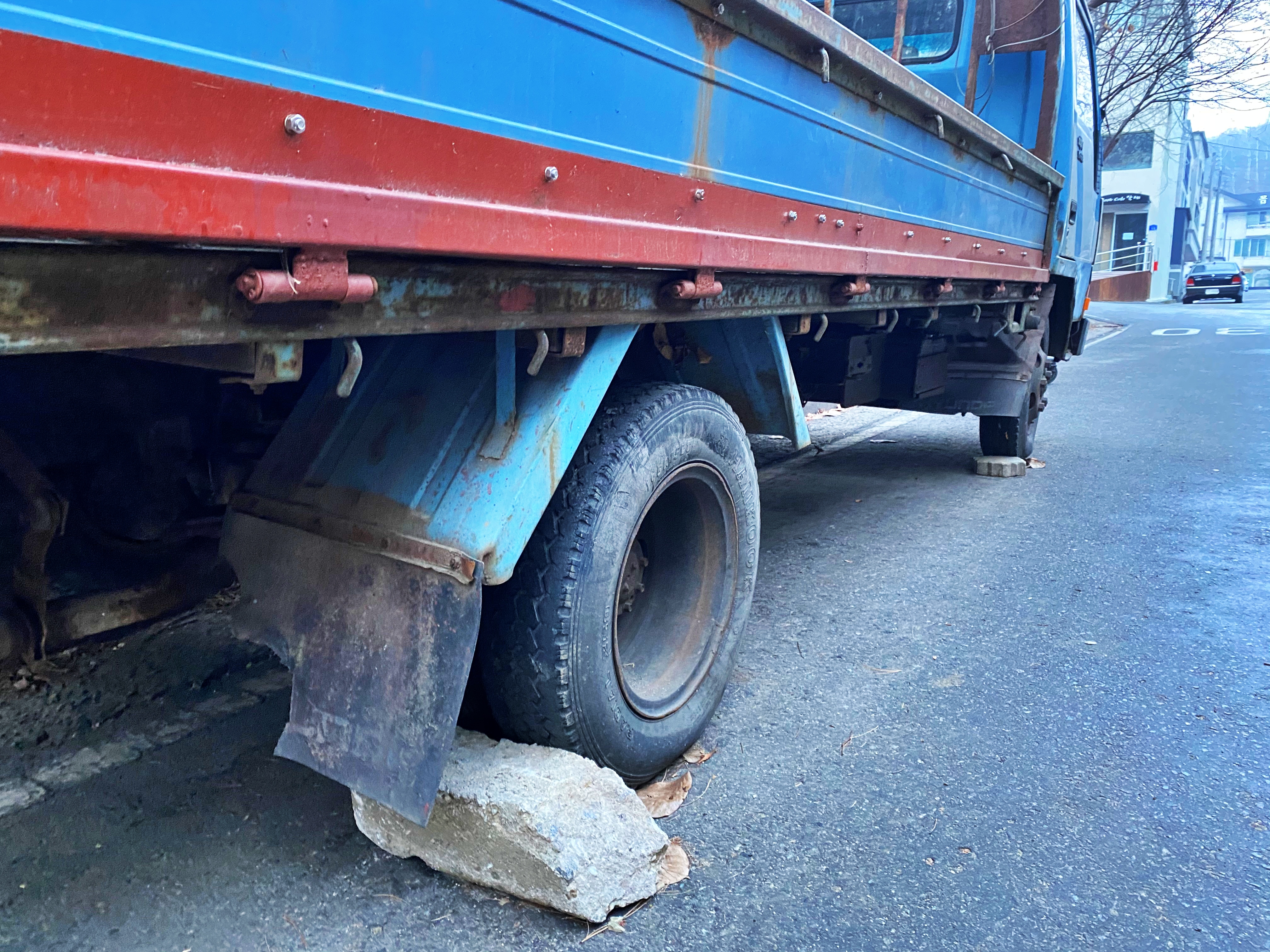 여기저기 표면에 녹이 핀 못브이 보이네요. 이유는 모르겠지만, 80년대 미쓰비시 트럭의 상징처럼 여겨지던 포인트 도색이 된 자리에만 녹이 피어있습니다. 미쓰비시 트럭을 그래도 생산하던 현대자동차의 트럭들 역시 이런 요소가 남아있었지만, 90년대 초반 부분변경을 거치며 모두 데칼로 변경되었습니다. 마이티 역시 94년 사각형 헤드램프로 대표되는 부분변경을 거치며 포인트 도색 대신 데칼로 포인트를 주는 방식으로 변경되었습니다.