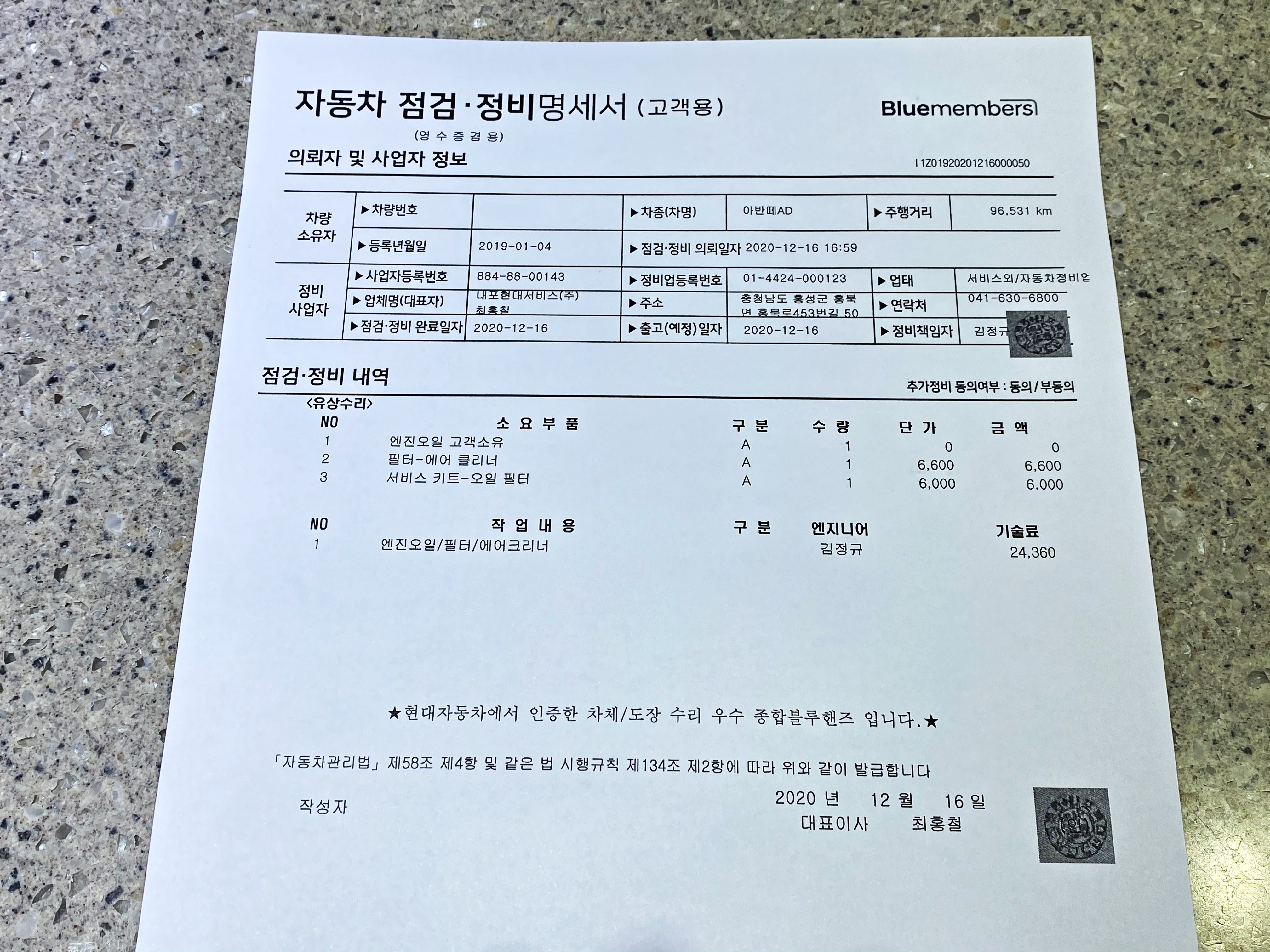 작업은 금방 끝났고, 별 이상은 없다고 합니다. 그럼요 아직 10만km도 달리지 않은 차량인데 벌써 이상이 있으면 어쩌겠습니까. 보증도 끝난 마당에 당분간은 조용히 소모품이나 갈고 다니면 될 것 같습니다. 그렇게 간단한 작업을 마치고 결제까지 마쳤습니다.
