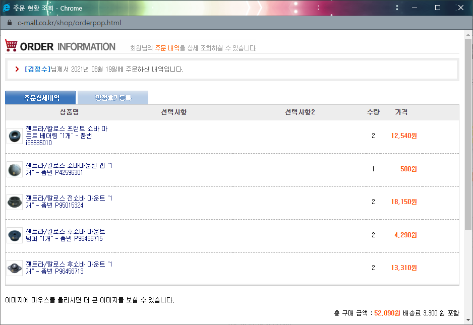 부피도 그렇게 크지 않은 고무쪼가리인데 배송비를 포함하니 5만원이 넘어가네요. 단순 쇼바 교체 비용만 생각해도 공임까지 약 30만원은 쓰리라 생각됩니다. 브레이크 고치고 또 로워암이라던지 볼조인트라던지 그런 하체부품들도 문제가 있어 고치게 된다면 또 차값 들어가겠네요.