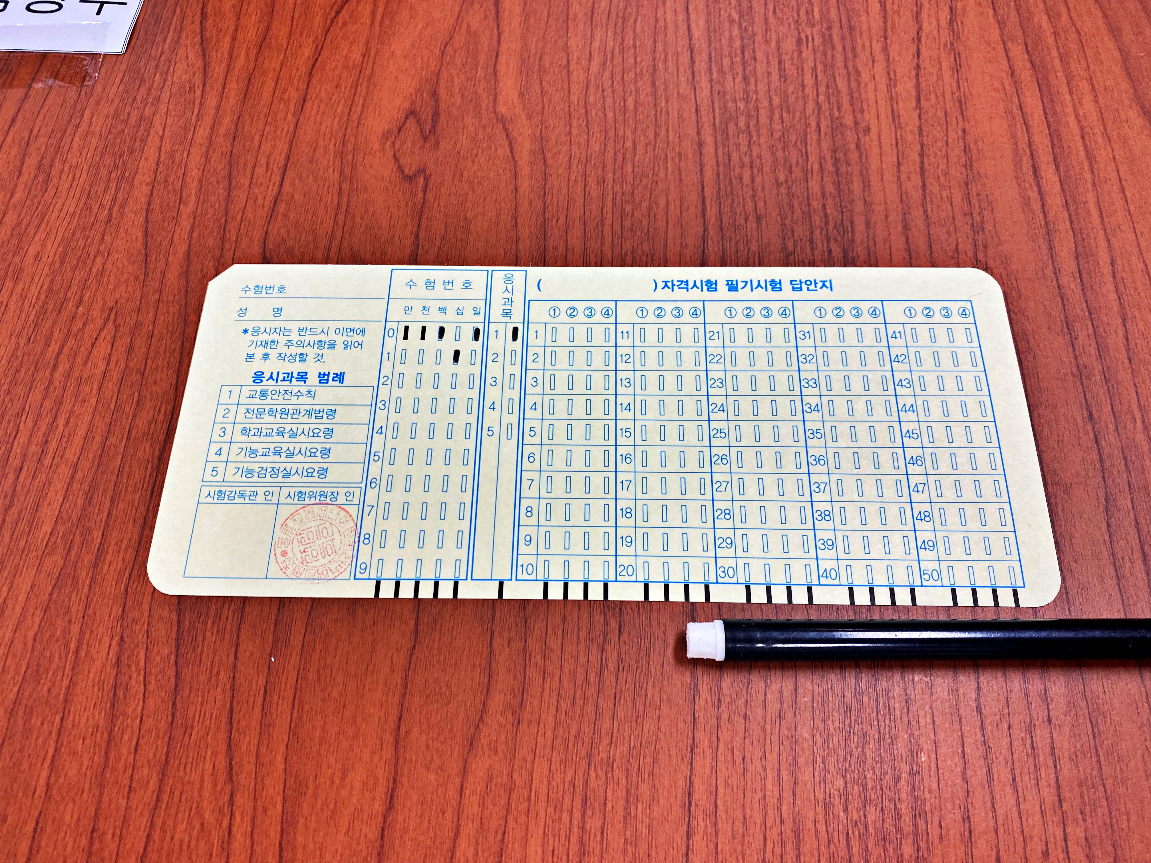이미 자리에는 수험번호와 응시과목이 마킹된 OMR카드가 있었습니다. 아마 고등학생때 쓰고 정말 오랜만에 써보는 OMR카드가 아닌가 싶습니다. 아마 그 이후에 OMR 카드를 사용했던 일이 있었을지 모르겠지만 고등학생 시절 이후 10년만에 보는 것 같습니다. 운전면허 학과시험을 보던 시절만 하더라도 다 CBT 시험으로 진행되었고, 이후 응시했던 자격증 시험들도 대부분 컴퓨터로 진행하는 CBT 시험을 봤으니 말이죠.