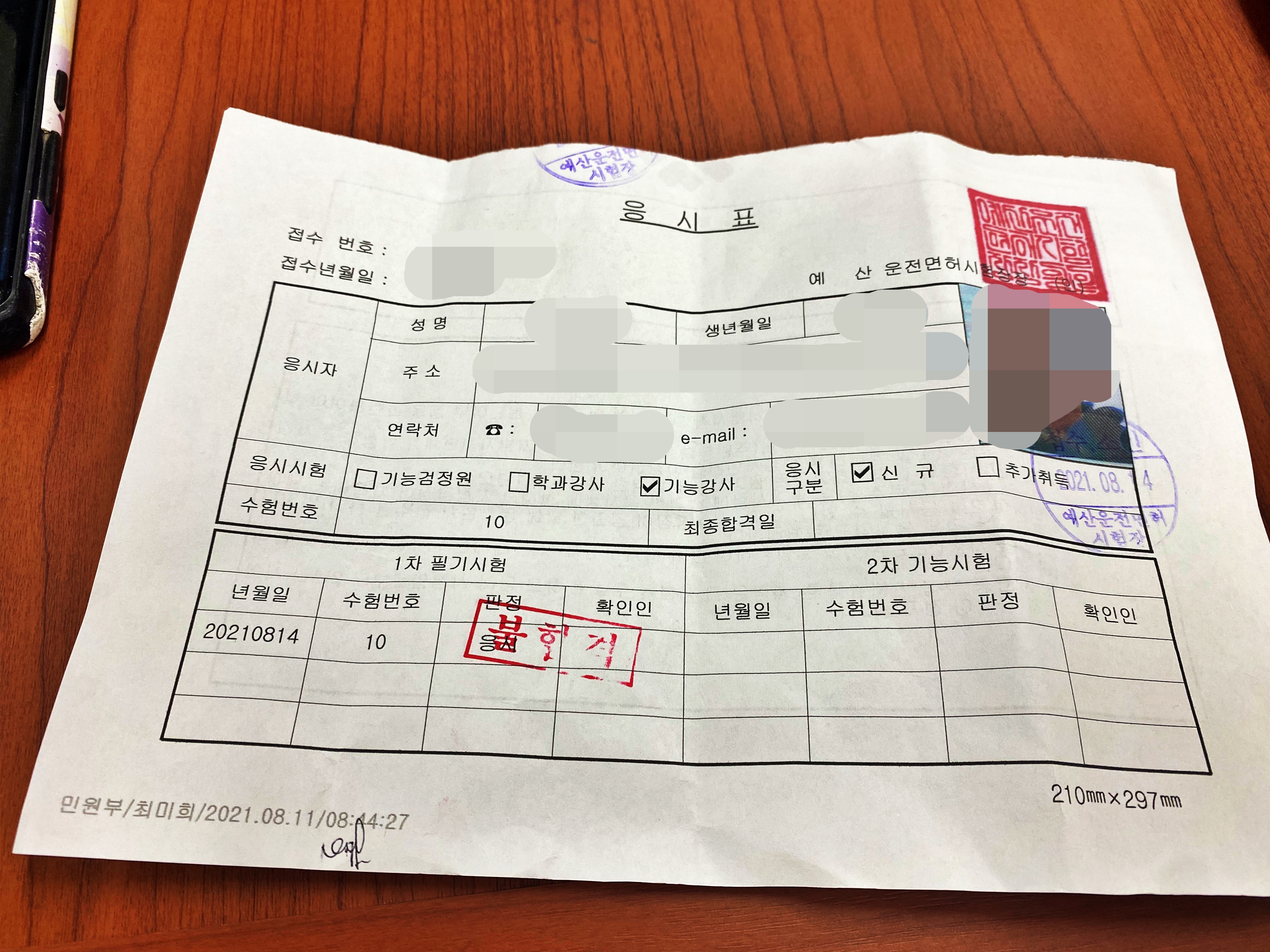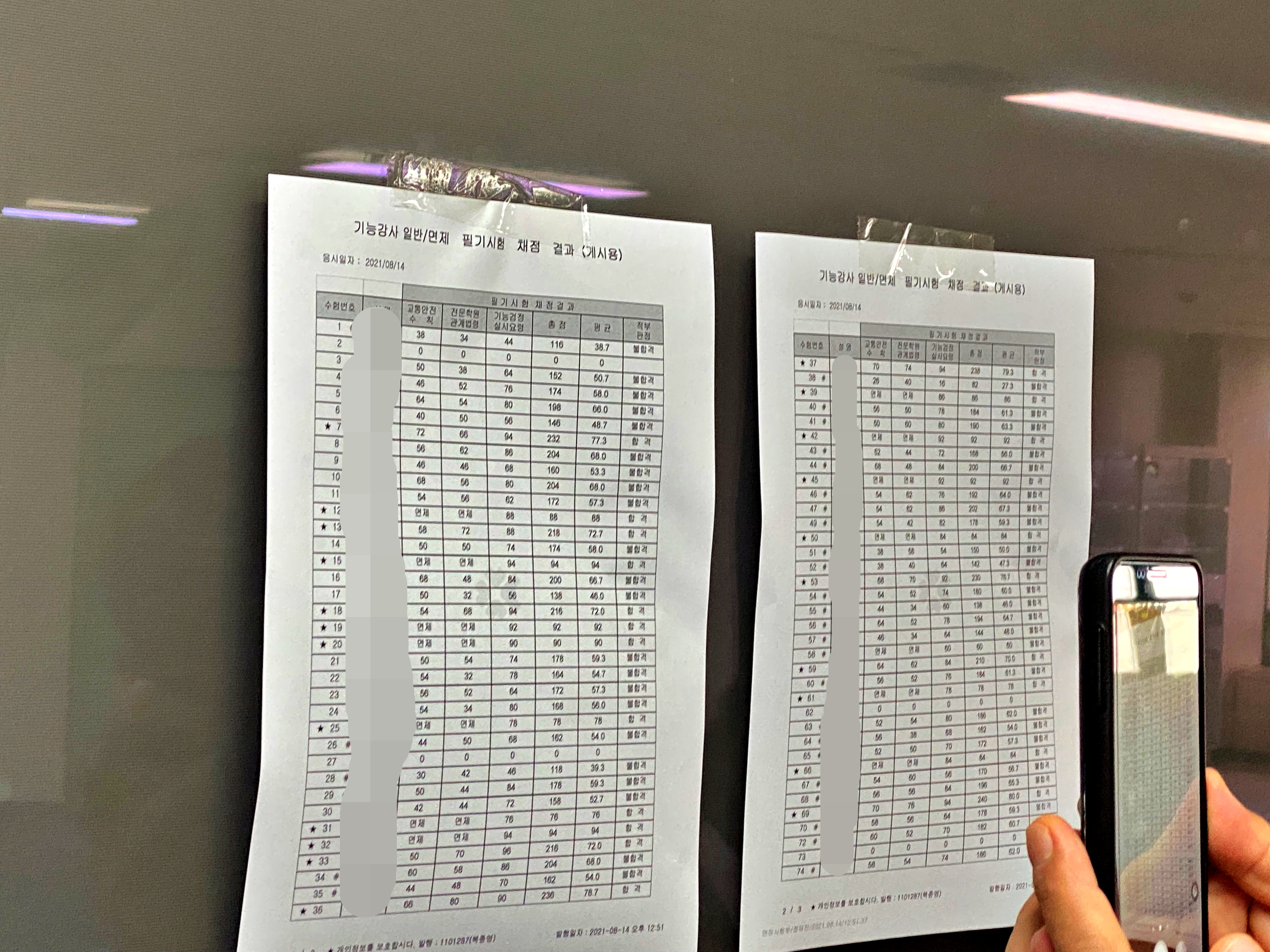 채점을 마치고 모두 자리로 와서 응시표를 받아가라고 한다. 이 과정에서 합격여부를 알 수 있다.
