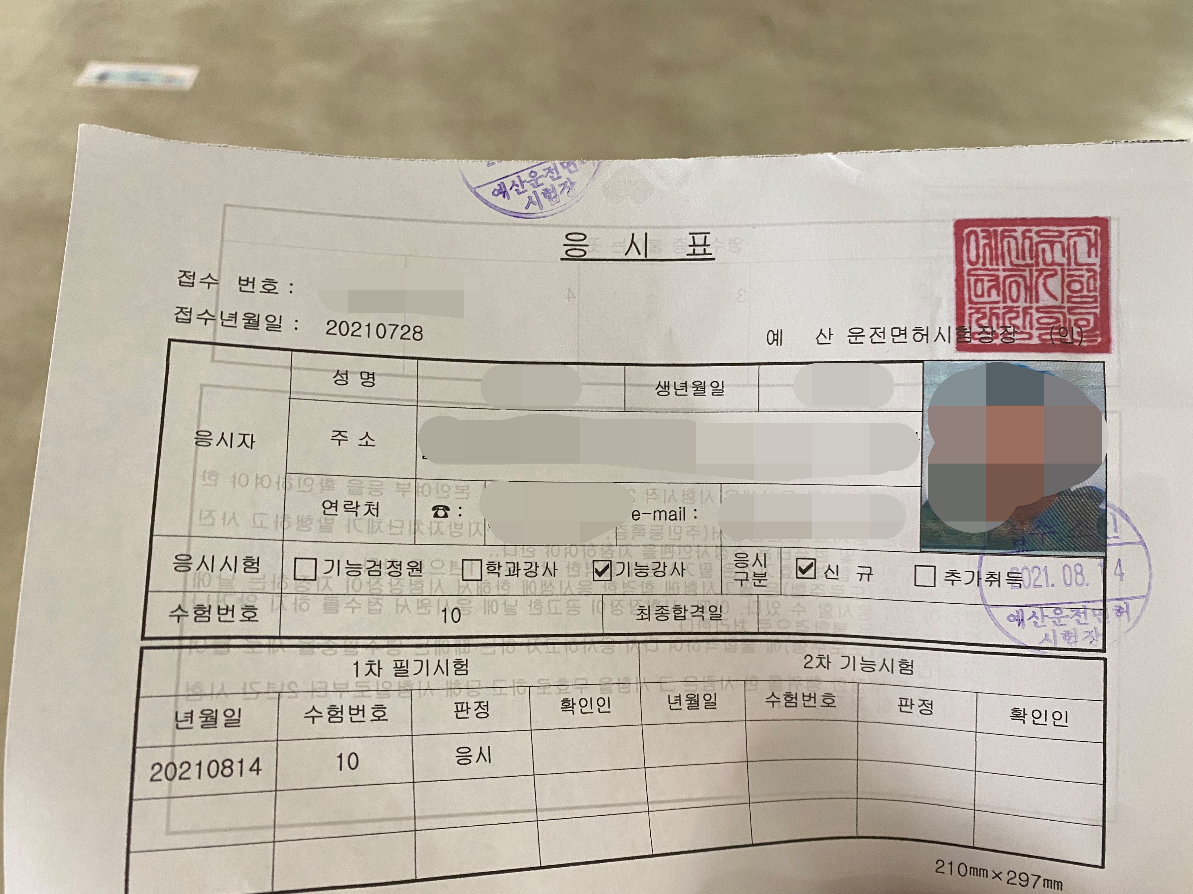 응시자의 인적사항과 사진 수험번호가 적혀있습니다. 1차로 필기시험이 진행되고, 2차로 기능시험이 진행됩니다. 필기시험에서 불합격하여 다시 응시하는 경우 새 응시표를 받습니다. 1차 필기시험에 합격하여 2차 기능시험에 응시하는 경우 기능시험 칸에 스티커가 붙겠죠.