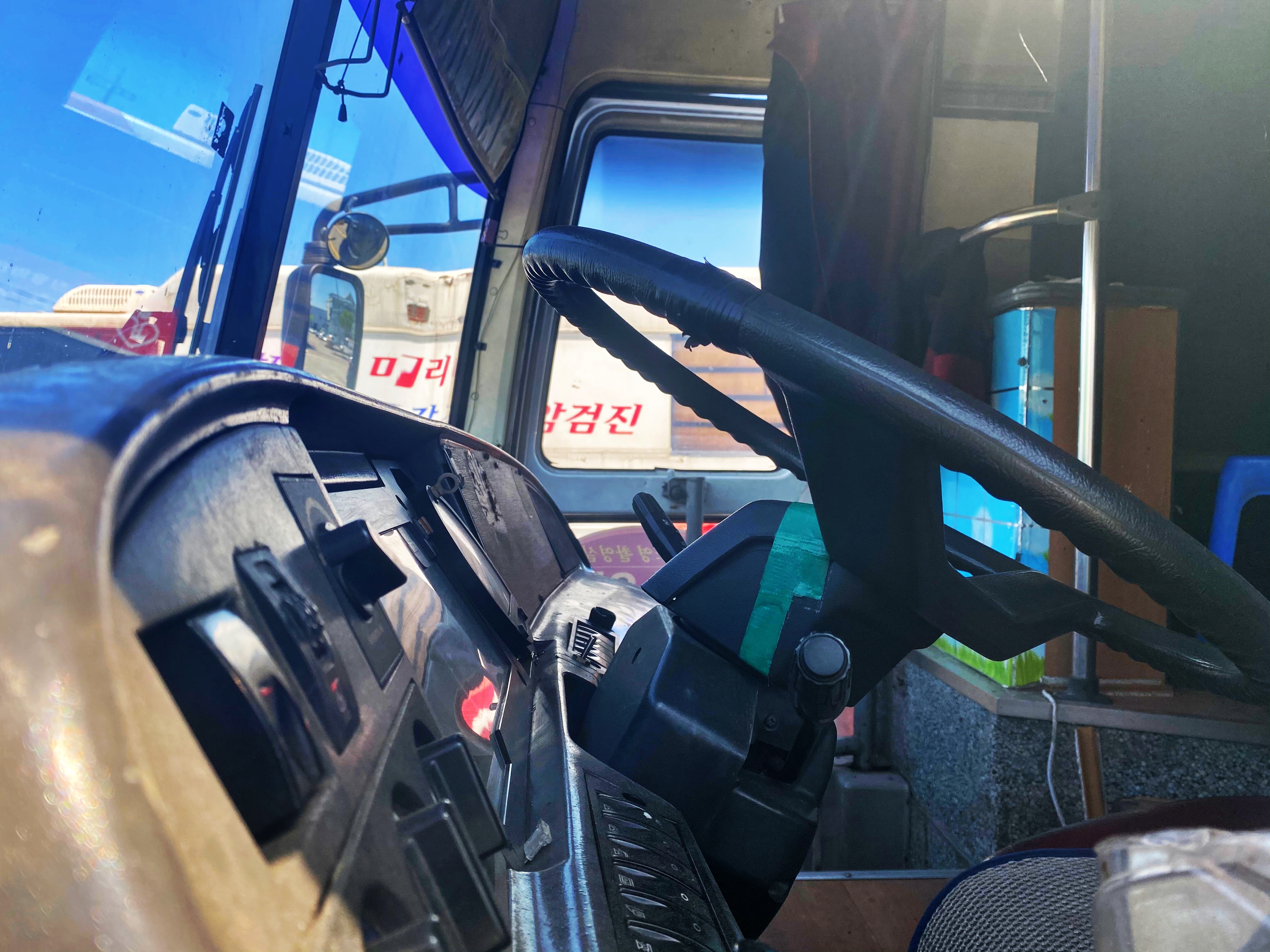 투박하지만 그래도 꽤나 버튼이 많았던 대시보드의 모습도 정말 오랜만에 봅니다. 오디오 자리는 나무판자로 막혀있네요. 그 외에는 버튼도 속도계도 손실된 부분 없이 잘 살아있습니다. 핸들에는 혼캡이 떨어졌는지 테이프가 붙어있네요. 핸들은 이전 세대 모델에서 사용했던 닛산 디젤 핸들을 그대로 사용합니다.
