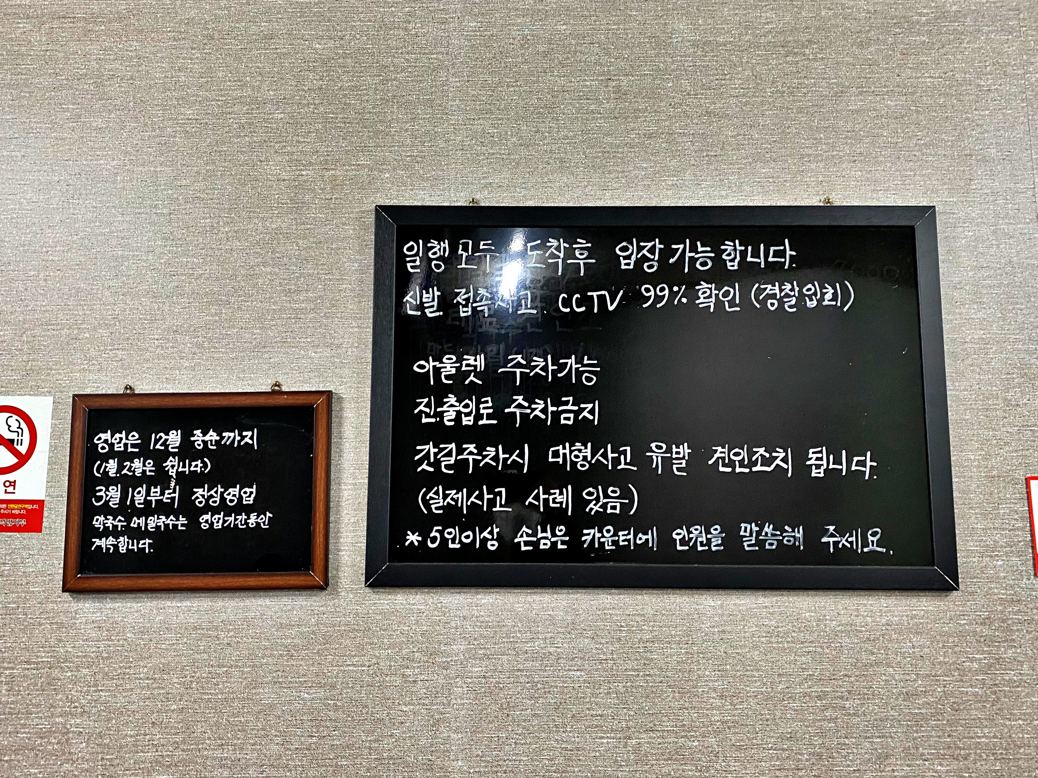 여러모로 손님이 몰리는 식당이다보니 갓길에 주차하는 차량들도 많아 도로를 달리던 차량과 사고가 생기기도 하고 신발도둑도 있어 이런저런 문제가 있었던 모양입니다. 그런고로 바로 위 아웃렛에 주차를 하고 걸어와도 됩니다.
