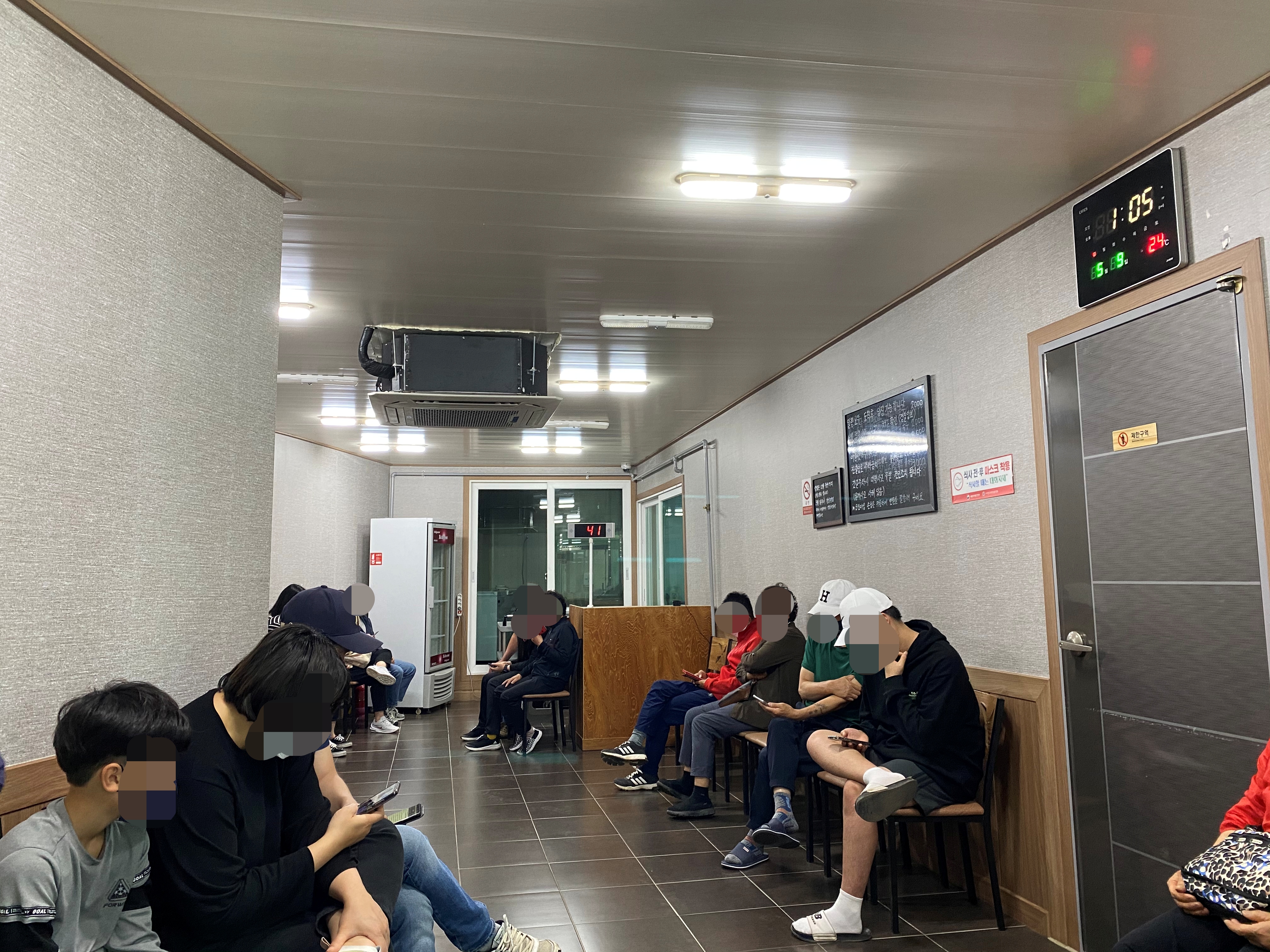 식당건물은 옆으로 증축하여 화장실과 대기실을 확충한 모습입니다. 체온을 측정하고 번호표를 뽑은 뒤 대기실에서 기다리면 됩니다. 기다리는 와중에도 사람들이 계속 몰려왔습니다.