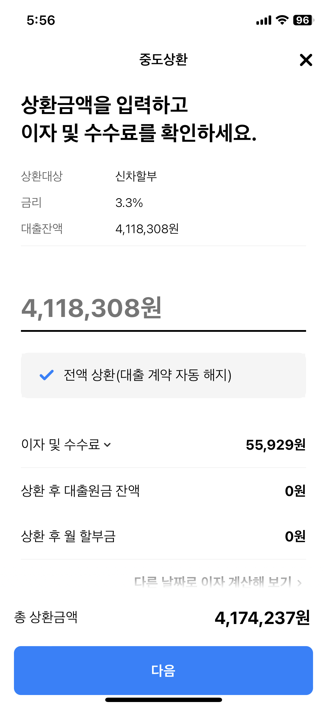 4,174,237원이 나오네요. 매월 약 35만원씩 4년간 납부한 뒤 남은 원금과 소정의 중도상환수수료입니다. 물론 남은 1년간 나눠 낸다고 가정하면 약 2만원 정도 더 내게 됩니다. 중도상환수수료가 꽤 비싸 큰 차이는 없네요.