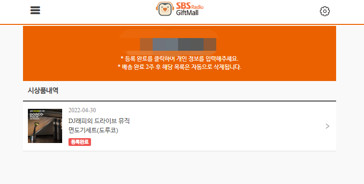 따로 상품 품목이 무엇인지는 듣지 못했는데, 도루코 면도기 세트입니다. SBS 라디오 기프트몰에 접속하여 개인정보를 입력하고 상품을 받아가라는 이야기네요. 기프트몰 링크로 접속합시다.