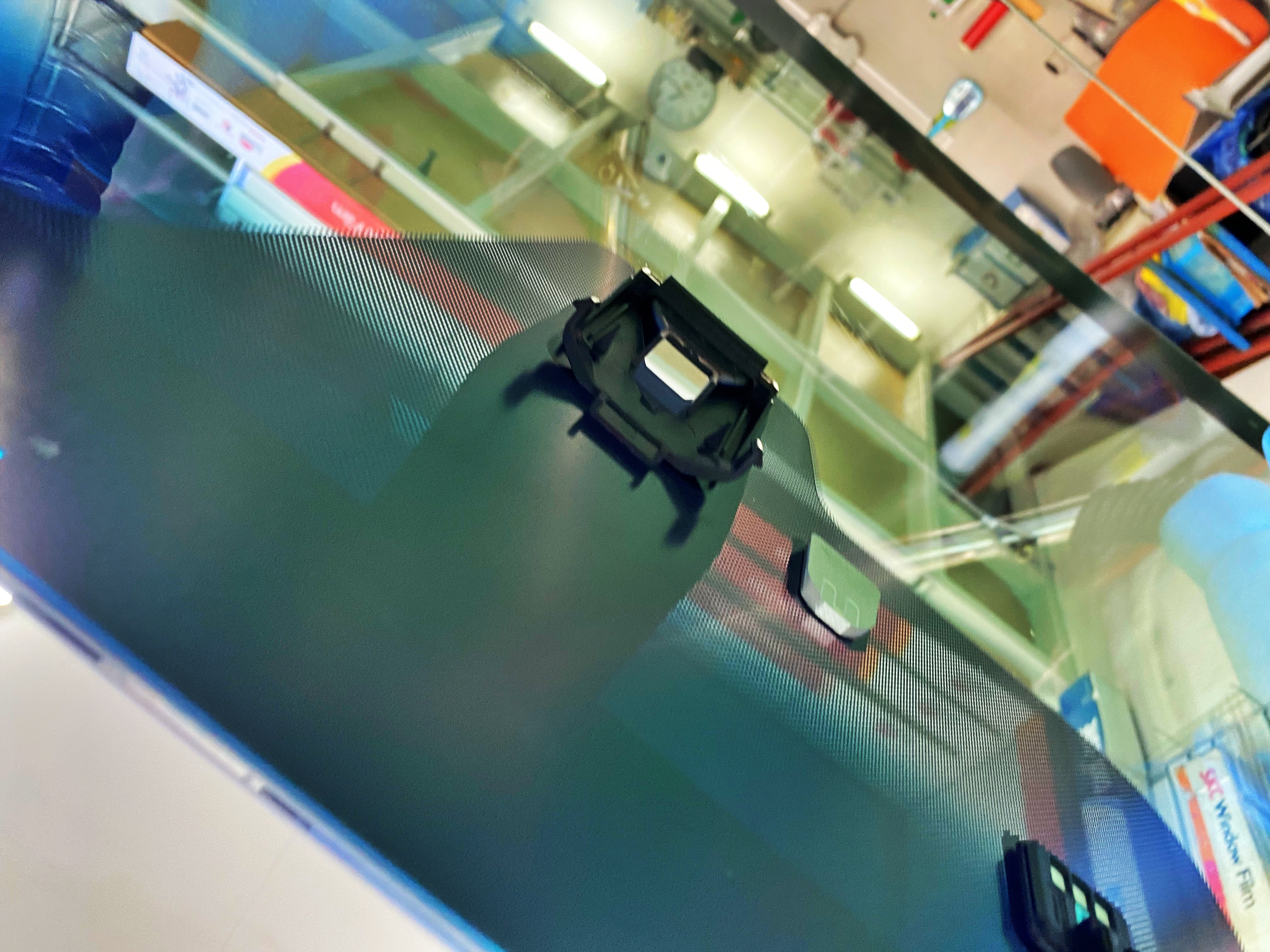 큰것은 차선감지카메라 그 옆은 룸미러 우측 끝에 보이는 것은 습기센서네요. 다 달려있으니 따로 기존 유리에서 이식하지 않아도 됩니다. 사실 유리작업이 꽤 오래걸릴거라 생각했는데 금방 끝나겠네요.