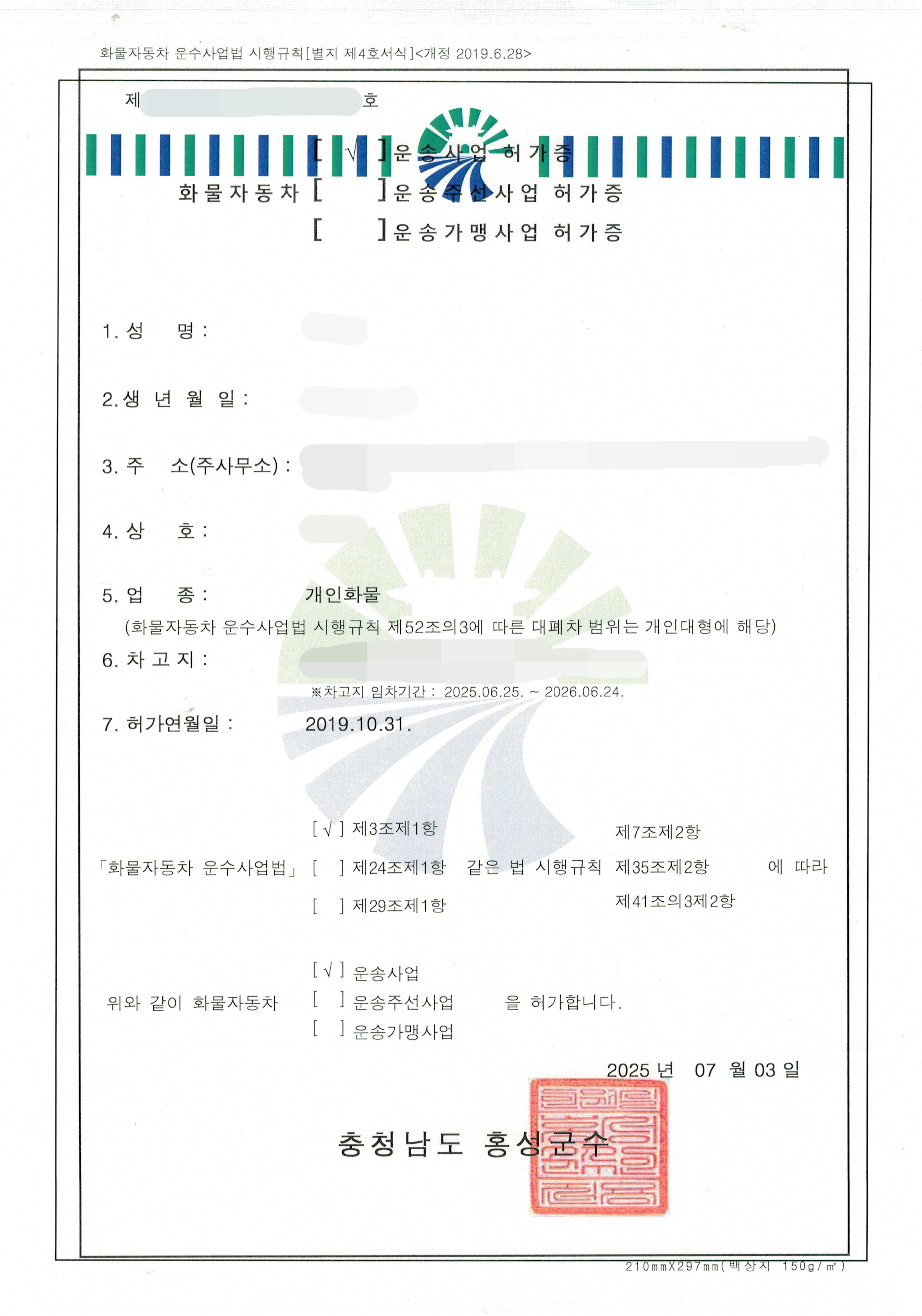 그렇게 화물자동차 운송사업 허가증을 받았습니다.