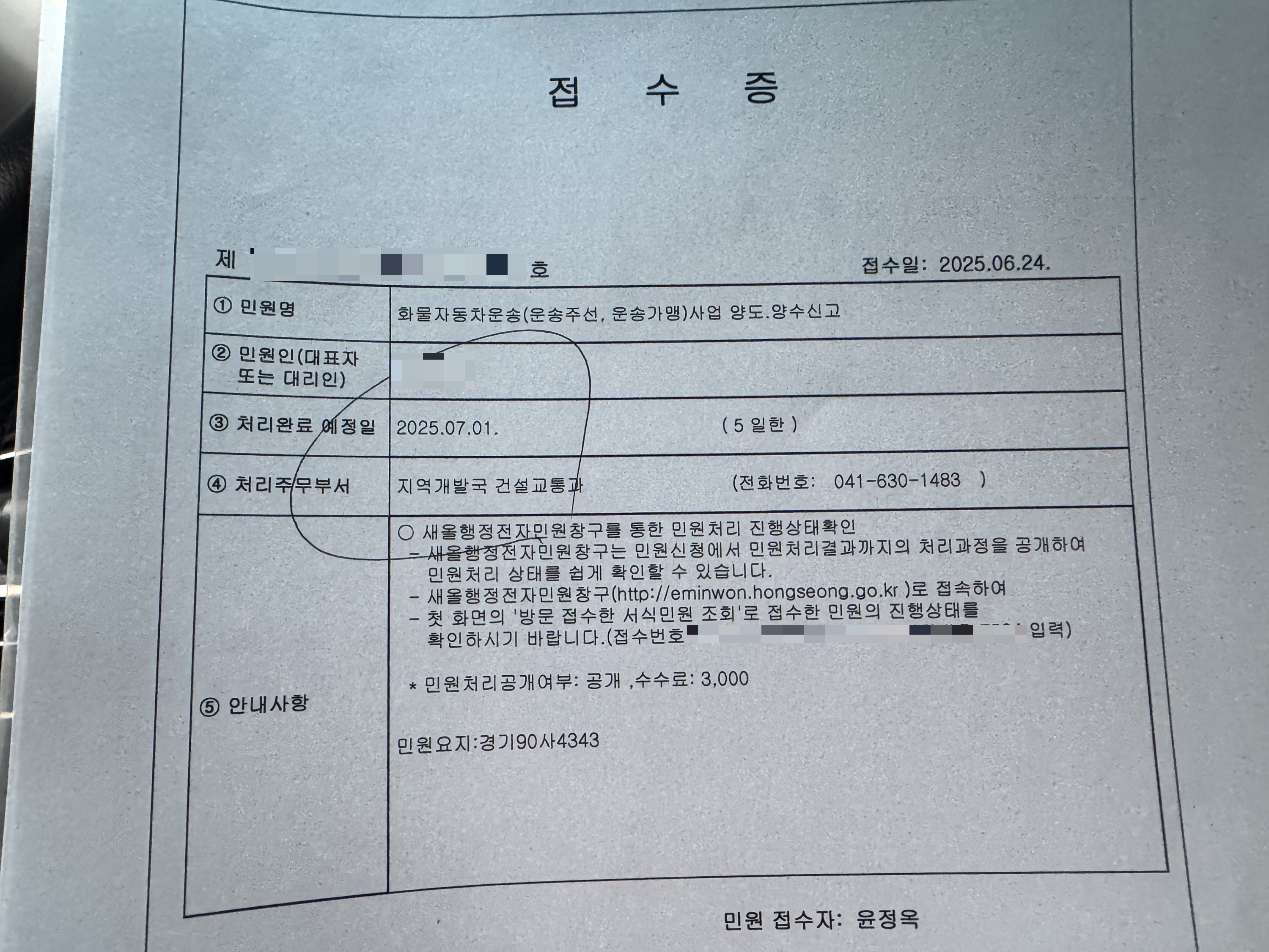 화물자동차운송사업 양도. 양수신고 서류를 접수했습니다.