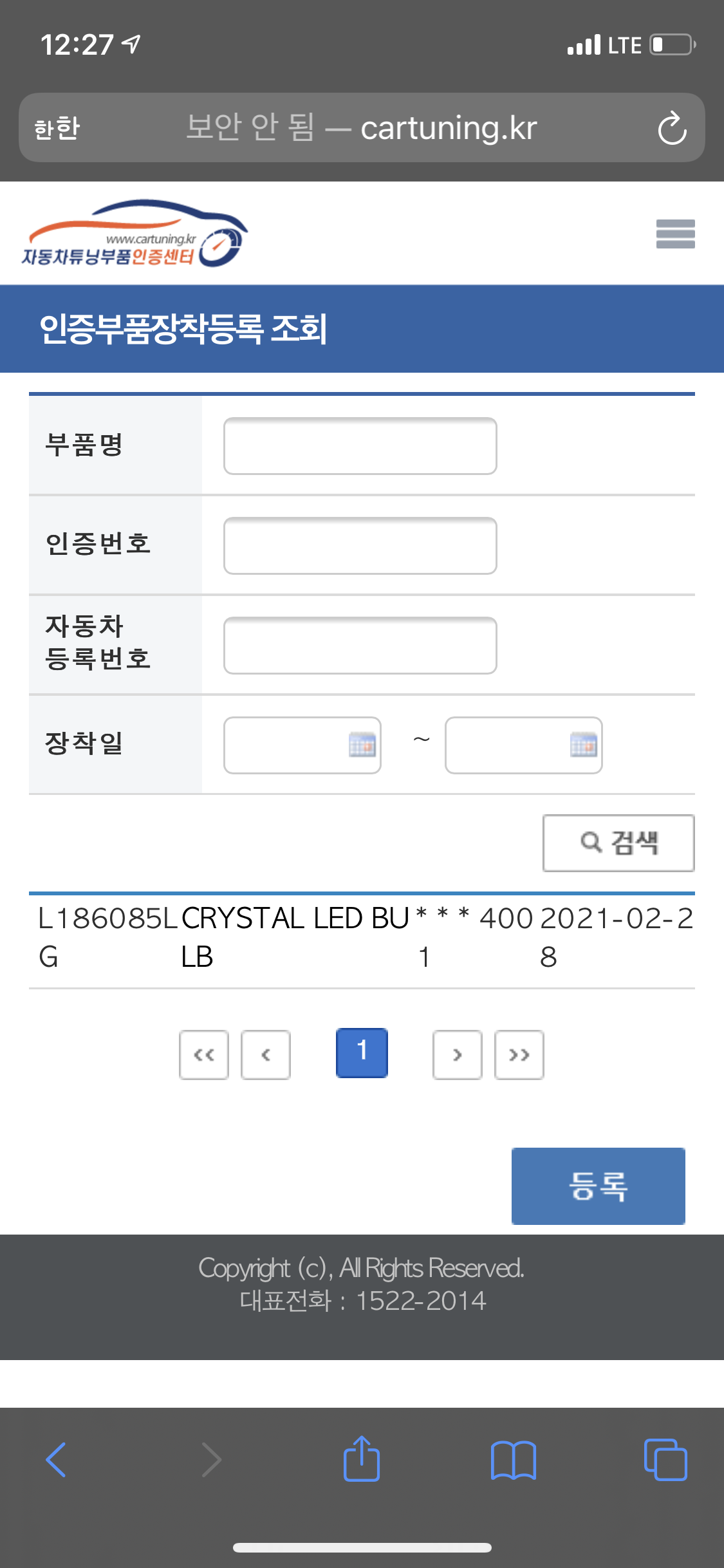 다음 버튼을 클릭하여 넘어가면 인증부품장착등록 조회라는 페이지가 표시됩니다.